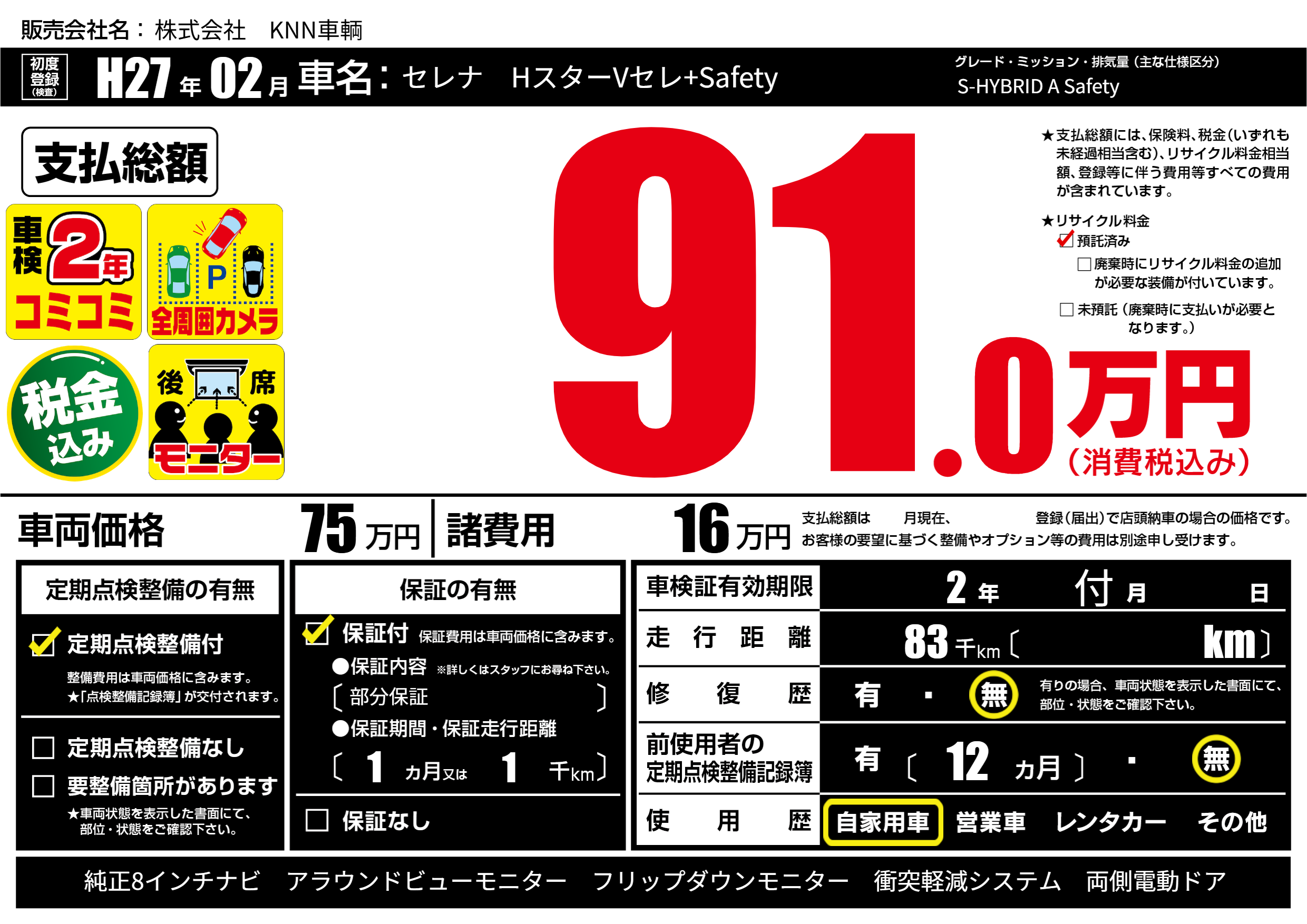 | 走行キロ | 8.3万km | 初年度登録 | H27年02月 |