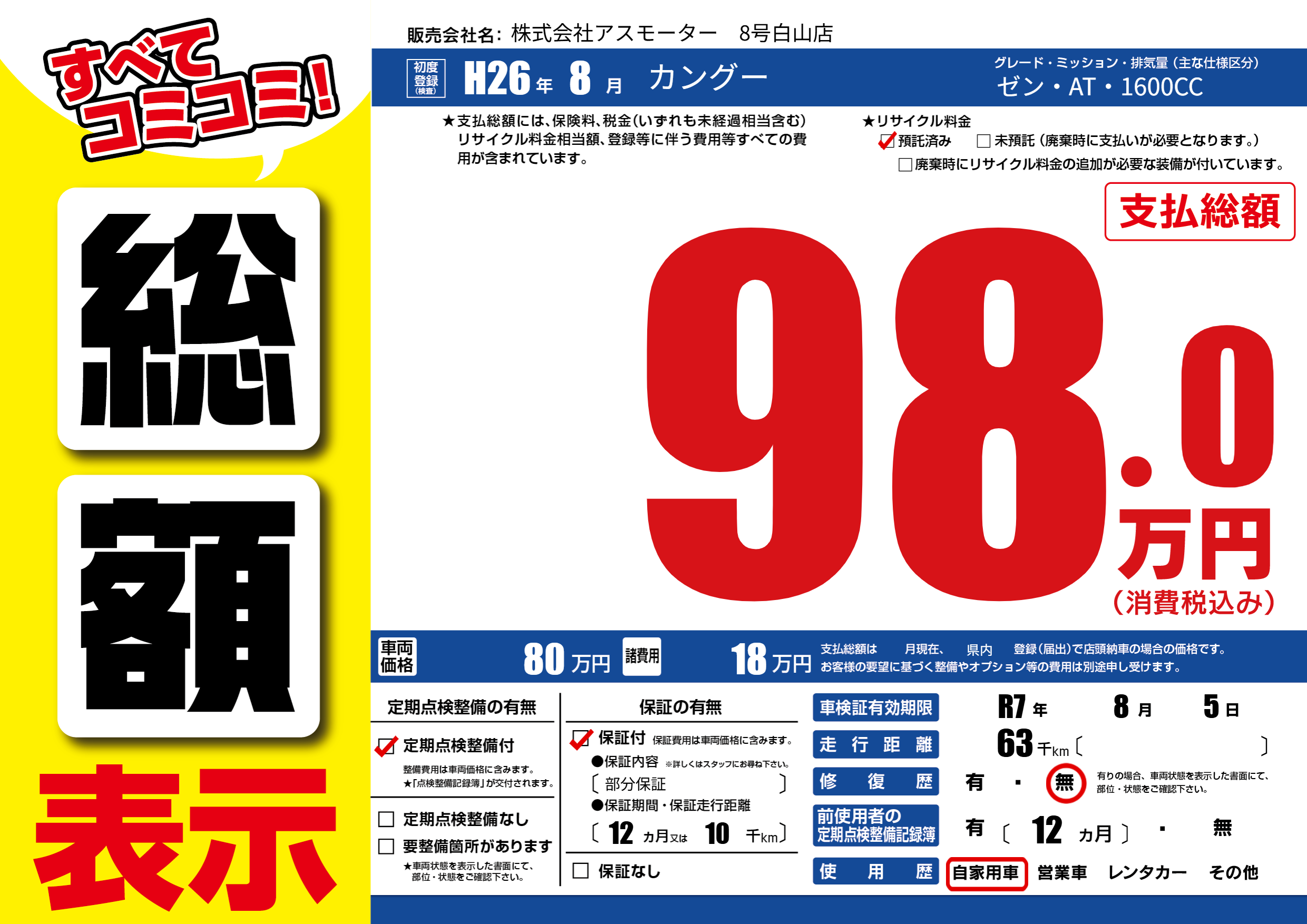 | 走行キロ | 6.3万km | 初年度登録 | H26年8月 |