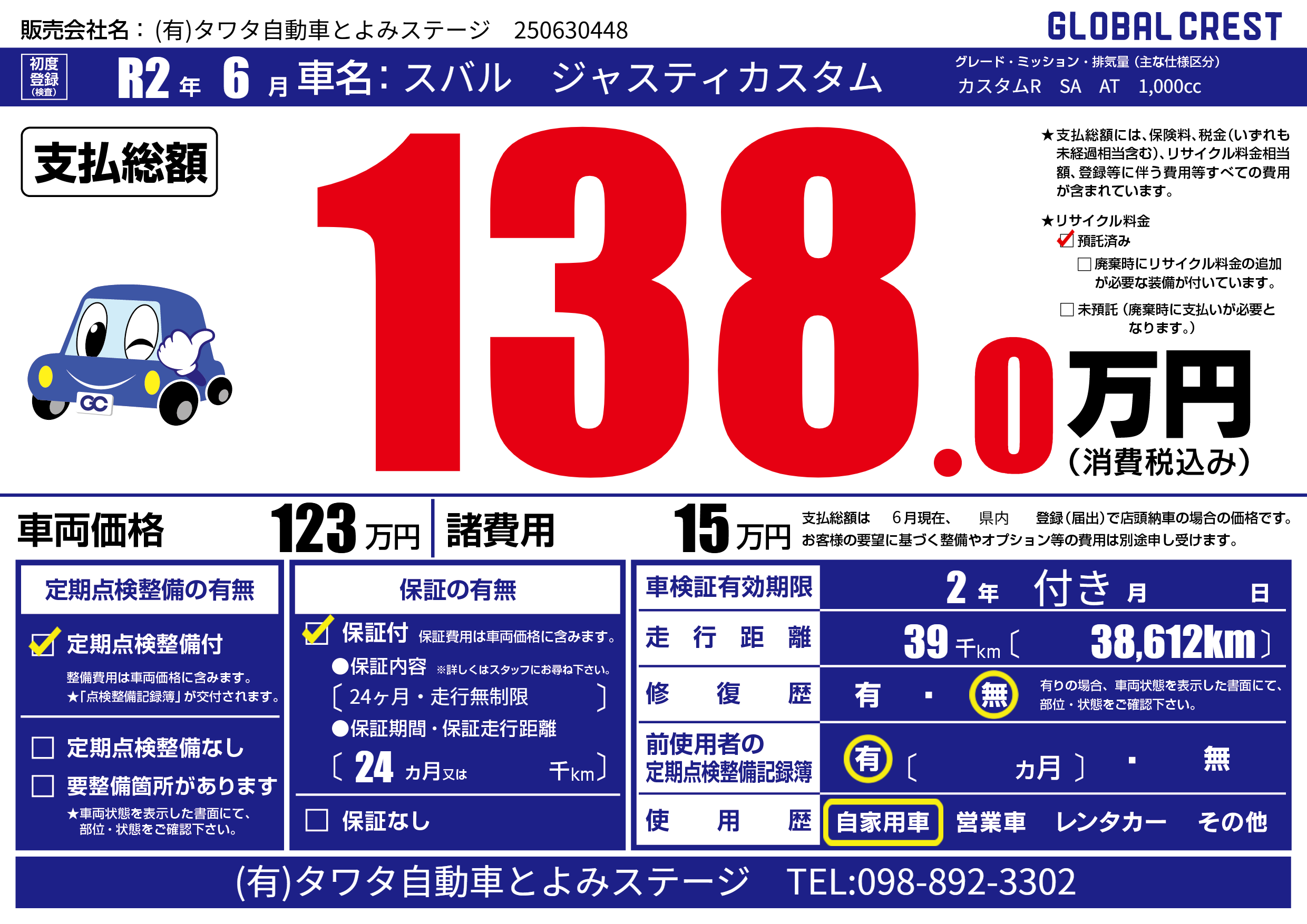 | 車名 | スバル ジャスティカスタム | グレード ミッション 排気量 |