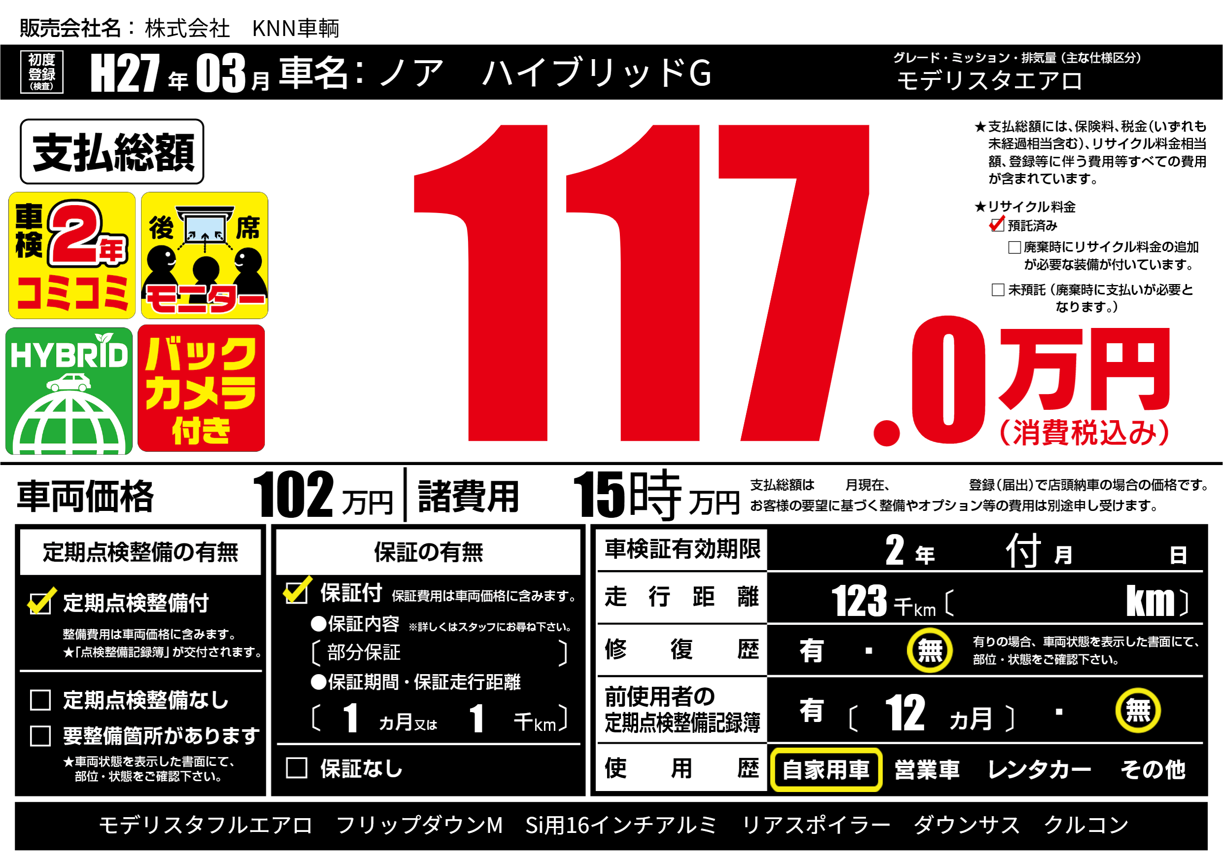 | 車名 | ノア ハイブリッドG | グレード ミッション 排気量 |