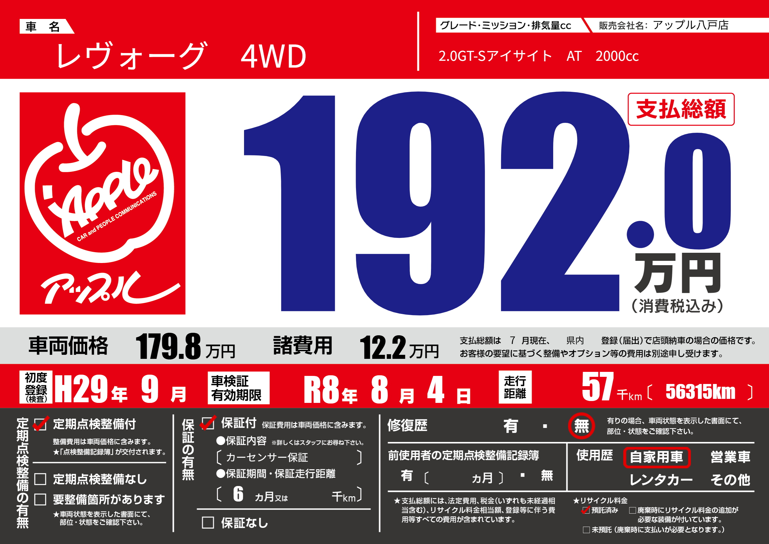 | 車名 | レヴォーグ 4WD | グレード ミッション 排気量 |