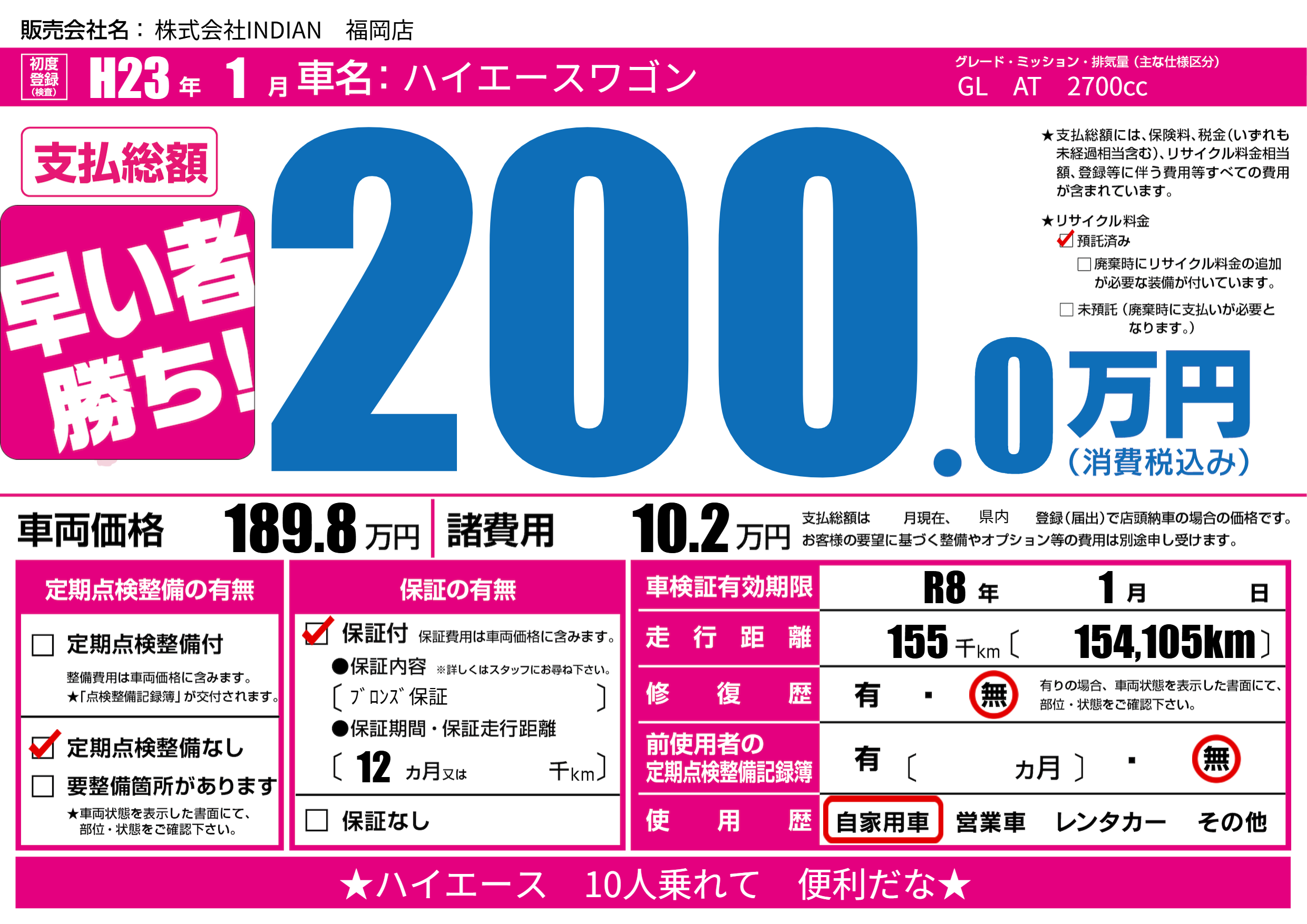 | 車名 | ハイエースワゴン | グレード ミッション 排気量 |