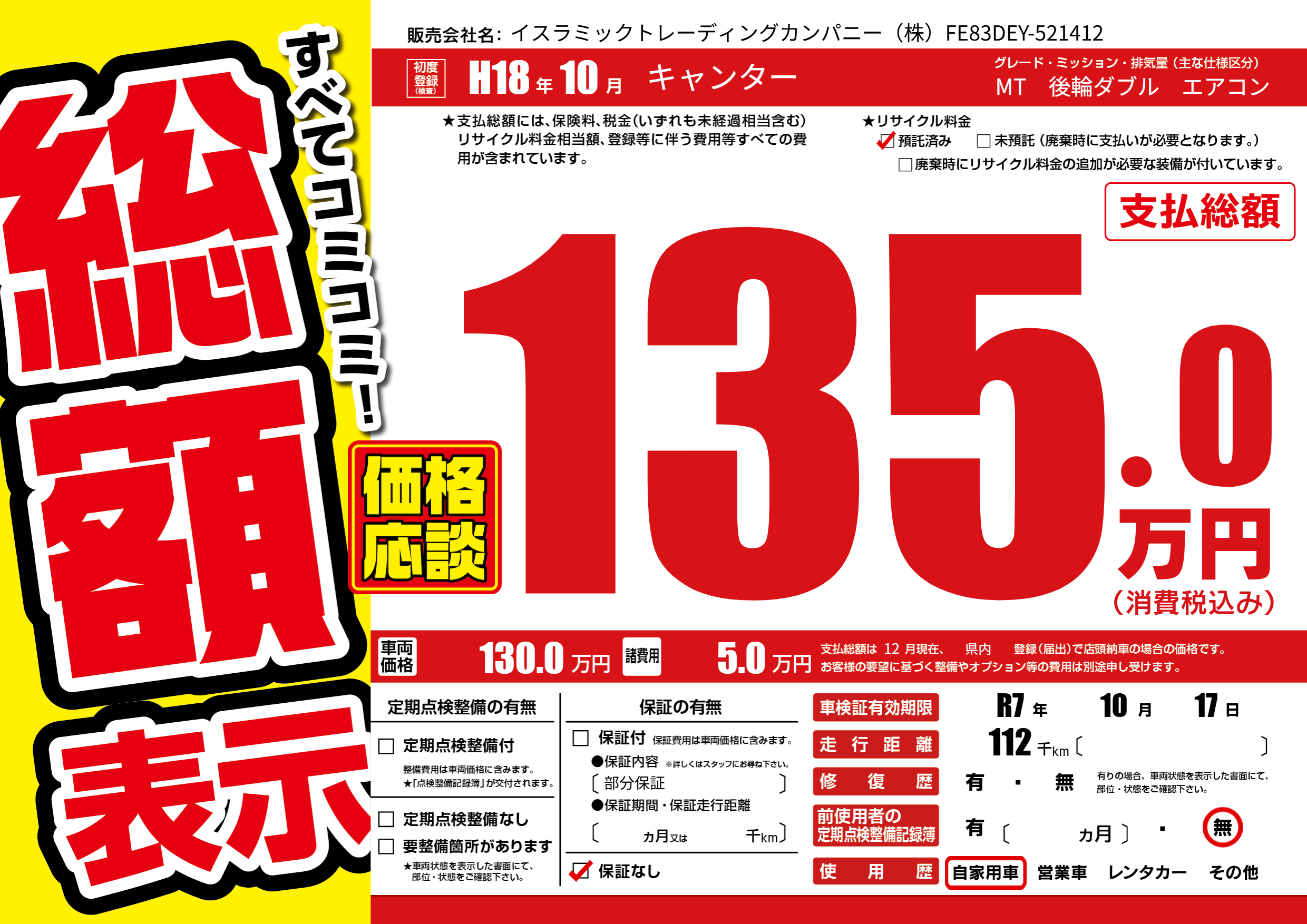 | 車名 | キャンター | グレード ミッション 排気量 |