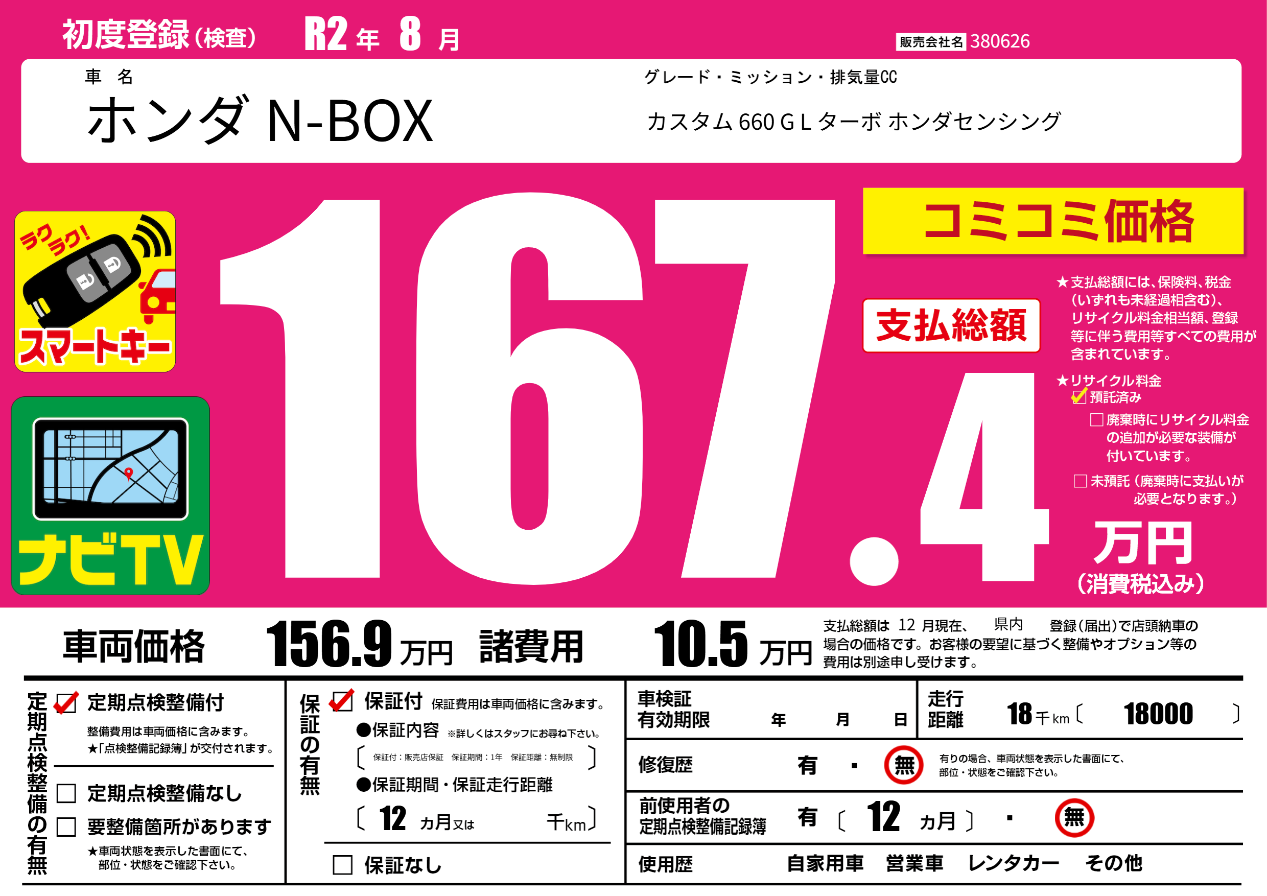 | 車名 | ホンダ N-BOX | グレード ミッション 排気量 |