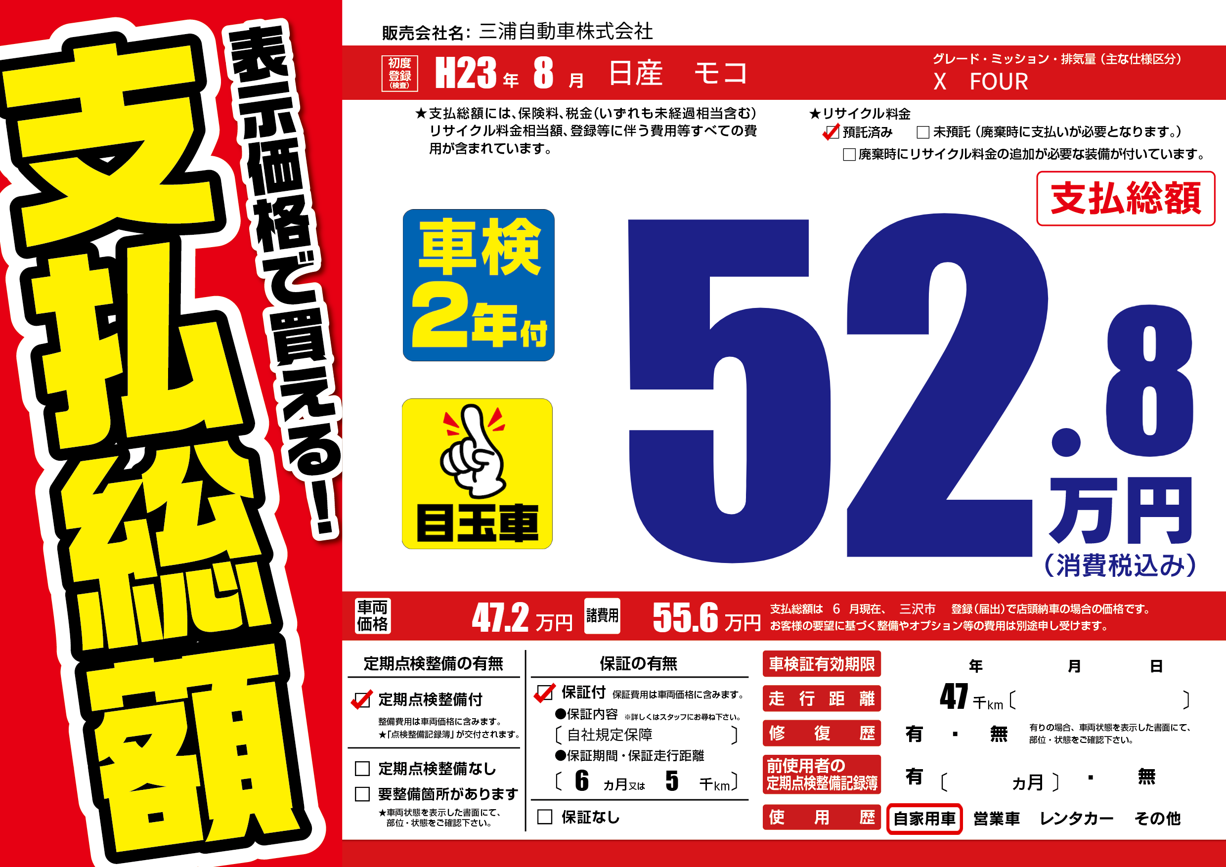 | 車名 | 日産 モコ | グレード ミッション 排気量 |