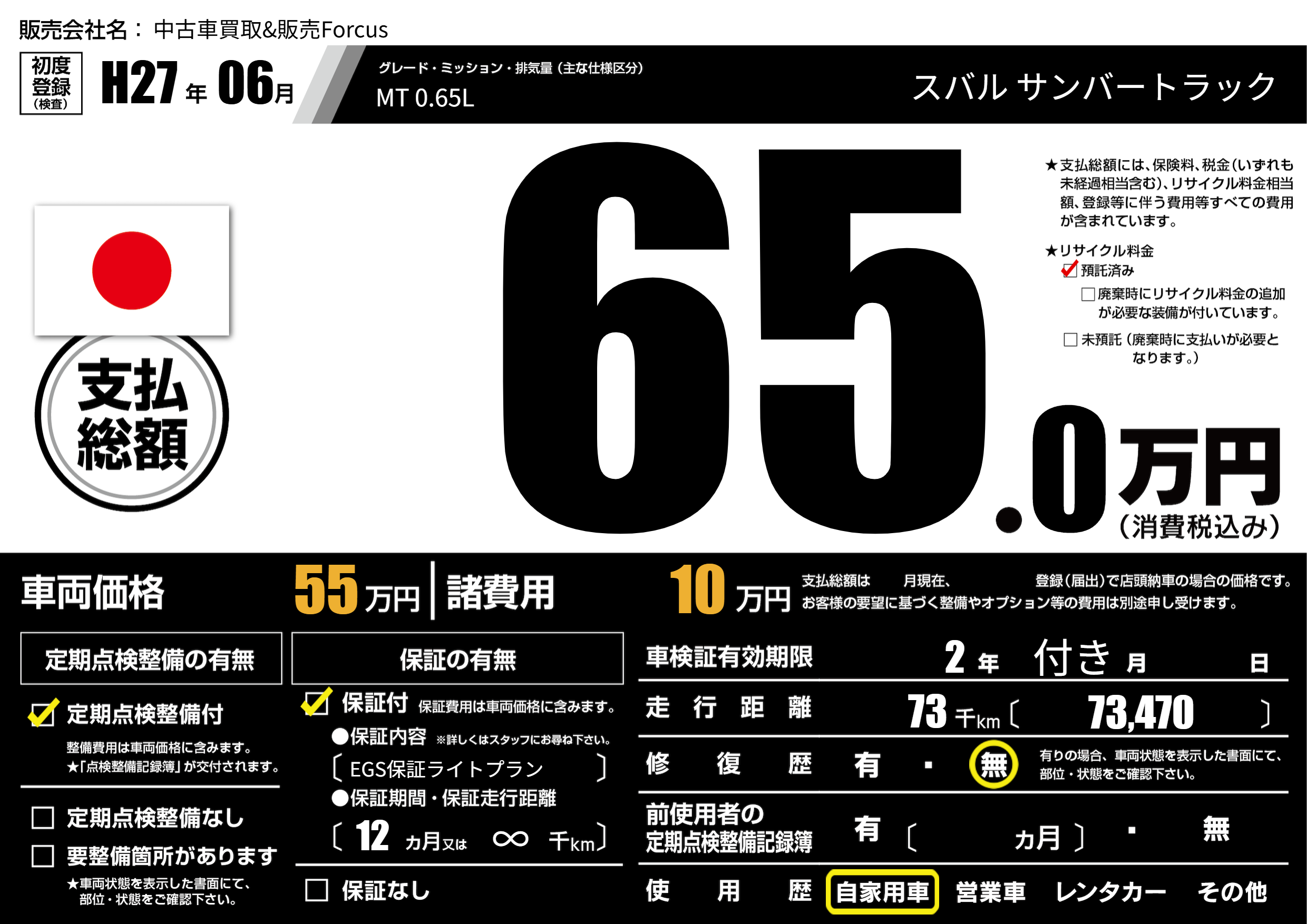 | 走行キロ | 7.3万km | 初年度登録 | H27年06月 |