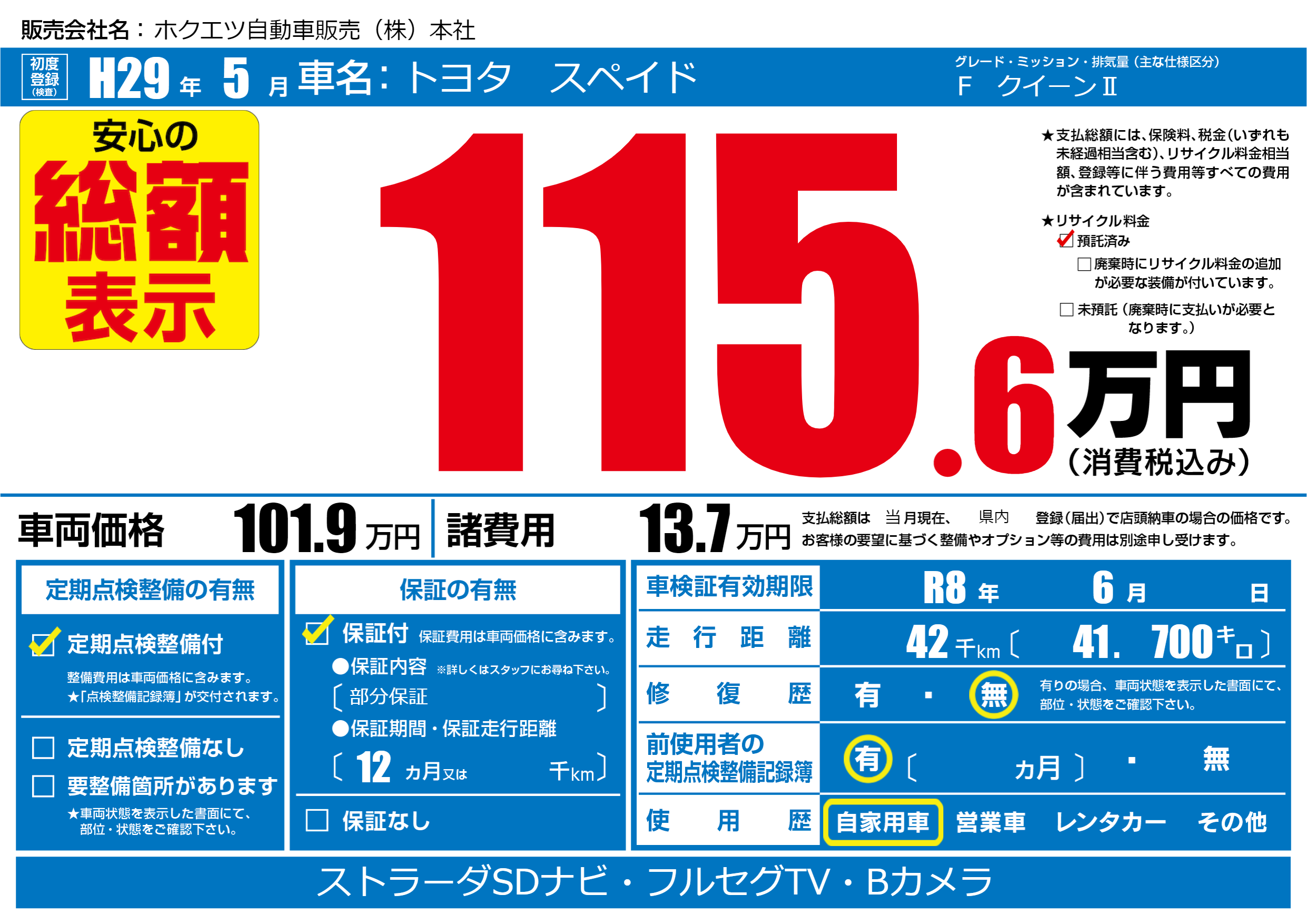 | 車名 | トヨタ スペイド | グレード ミッション 排気量 |