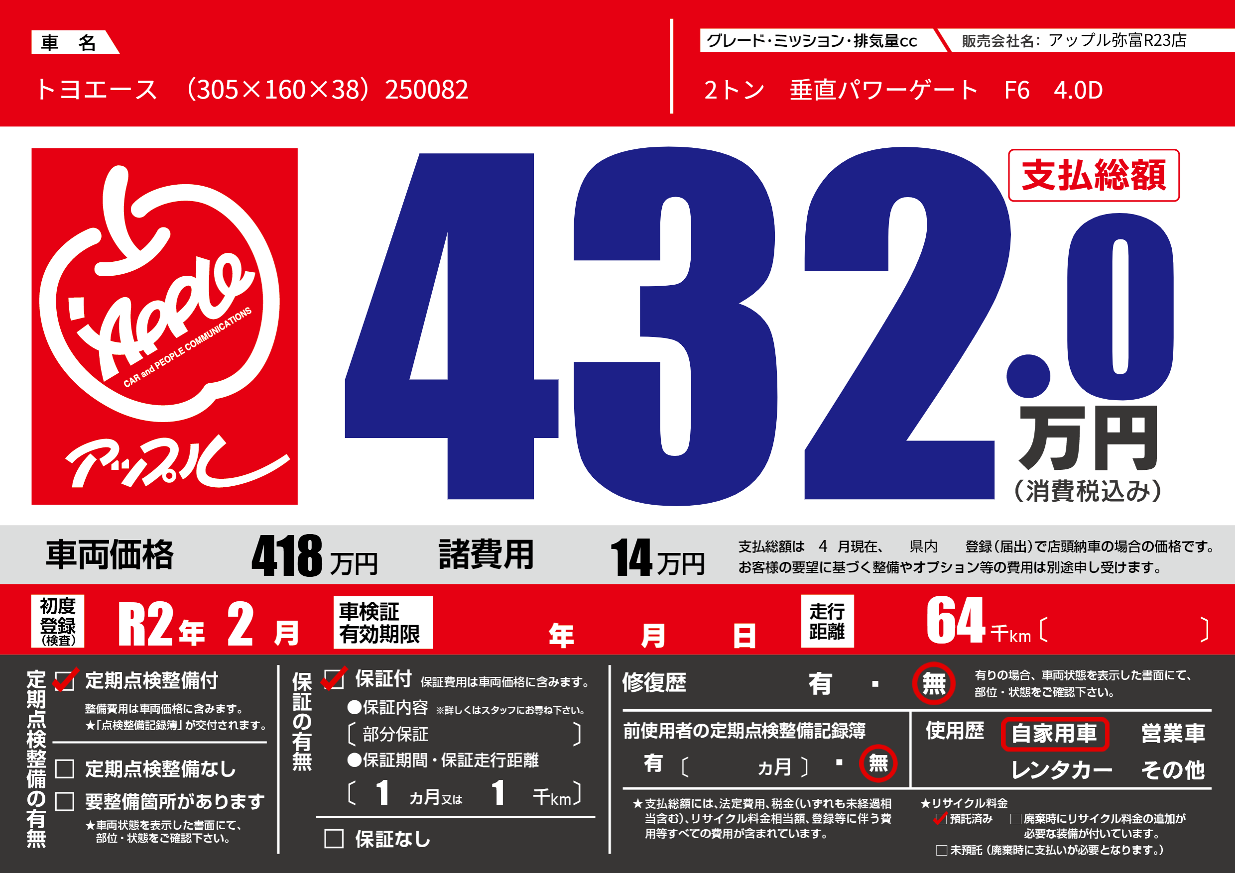 | 車名 | トヨエース (305×160×38)250082 | グレード ミッション 排気量 |