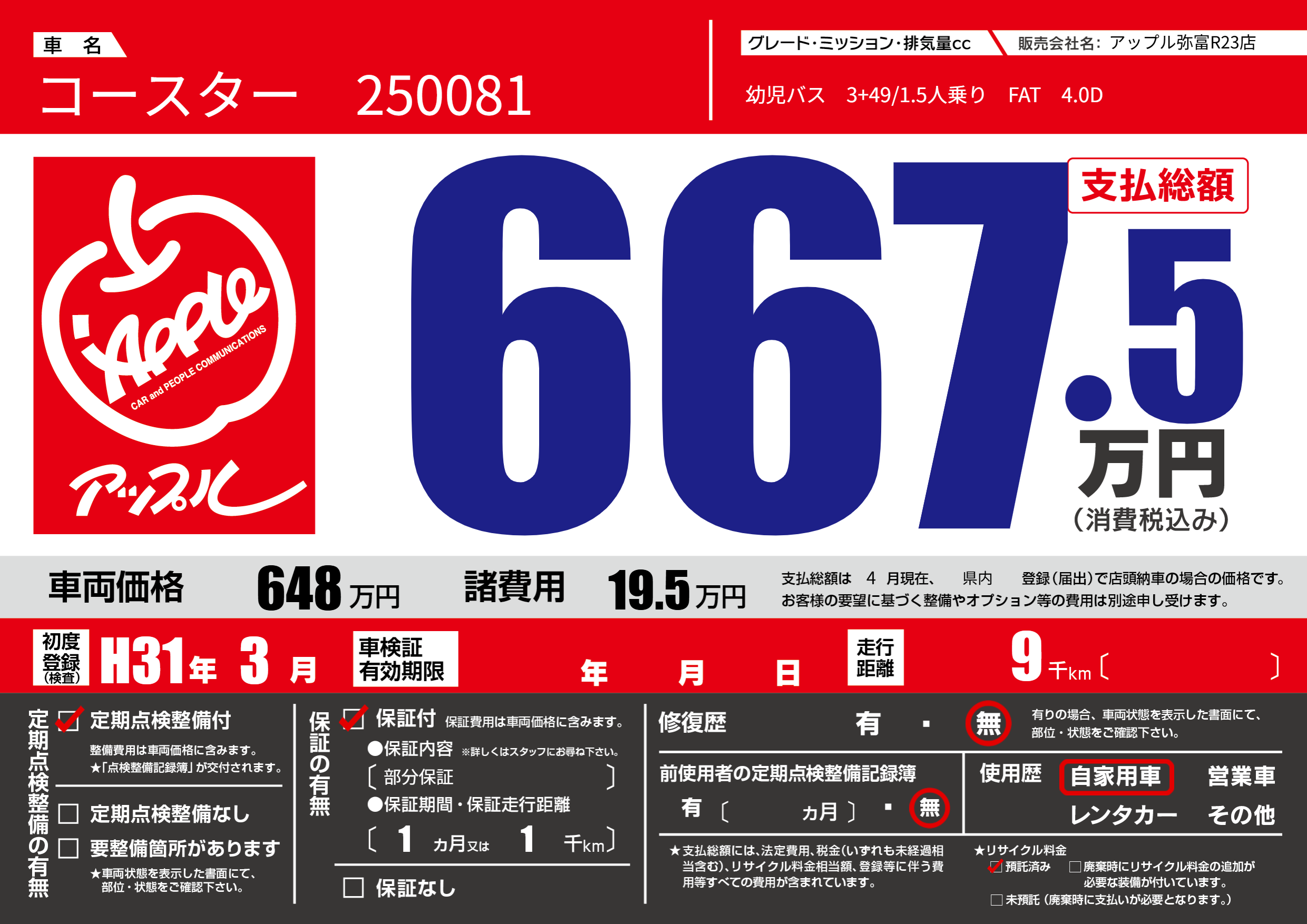 | 車名 | コースター 250081 | グレード ミッション 排気量 |