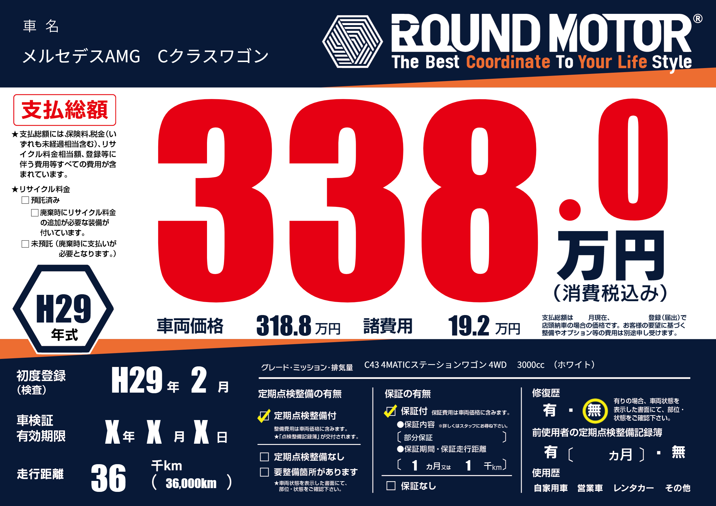 | 車名 | メルセデスAMG Cクラスワゴン | グレード ミッション 排気量 |