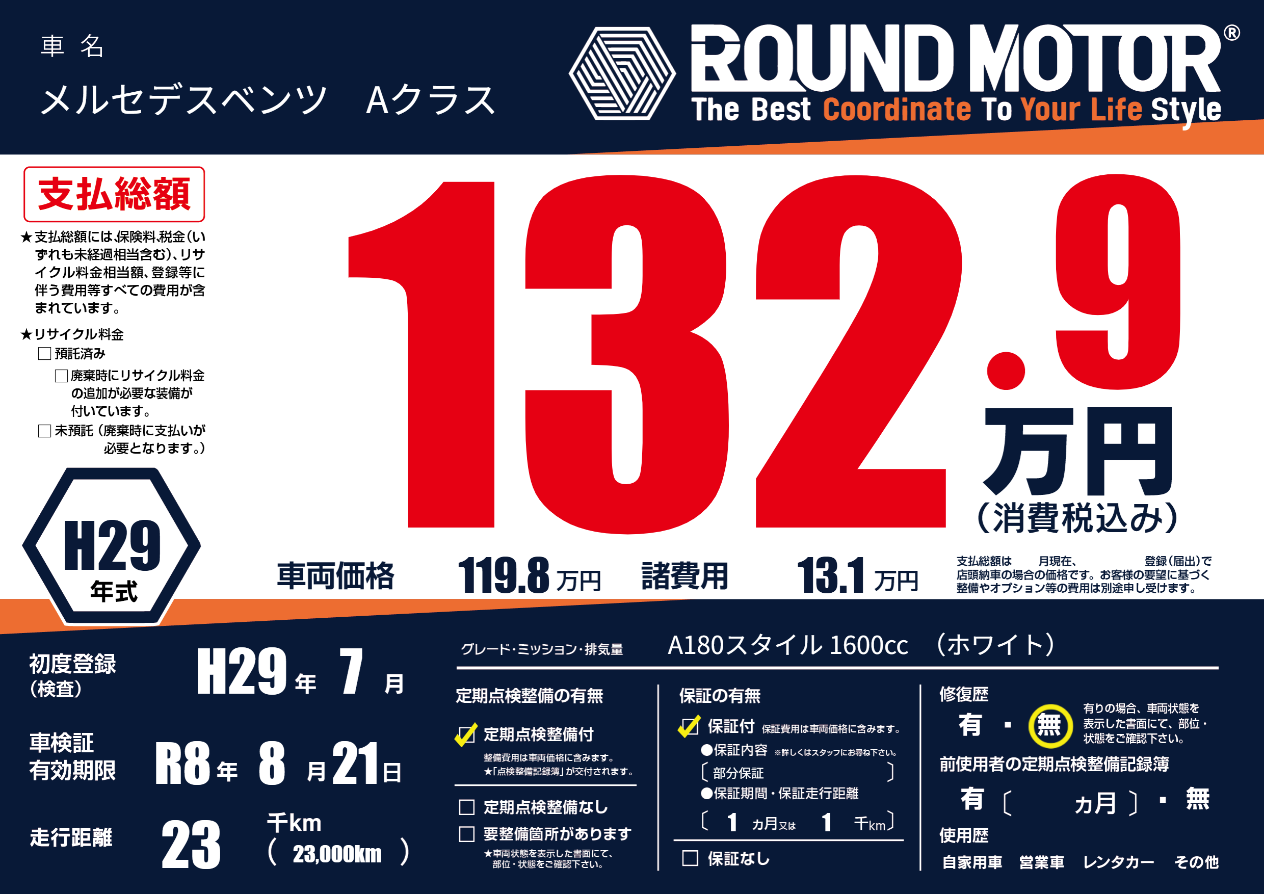 | 車名 | メルセデスベンツ Aクラス | グレード ミッション 排気量 |