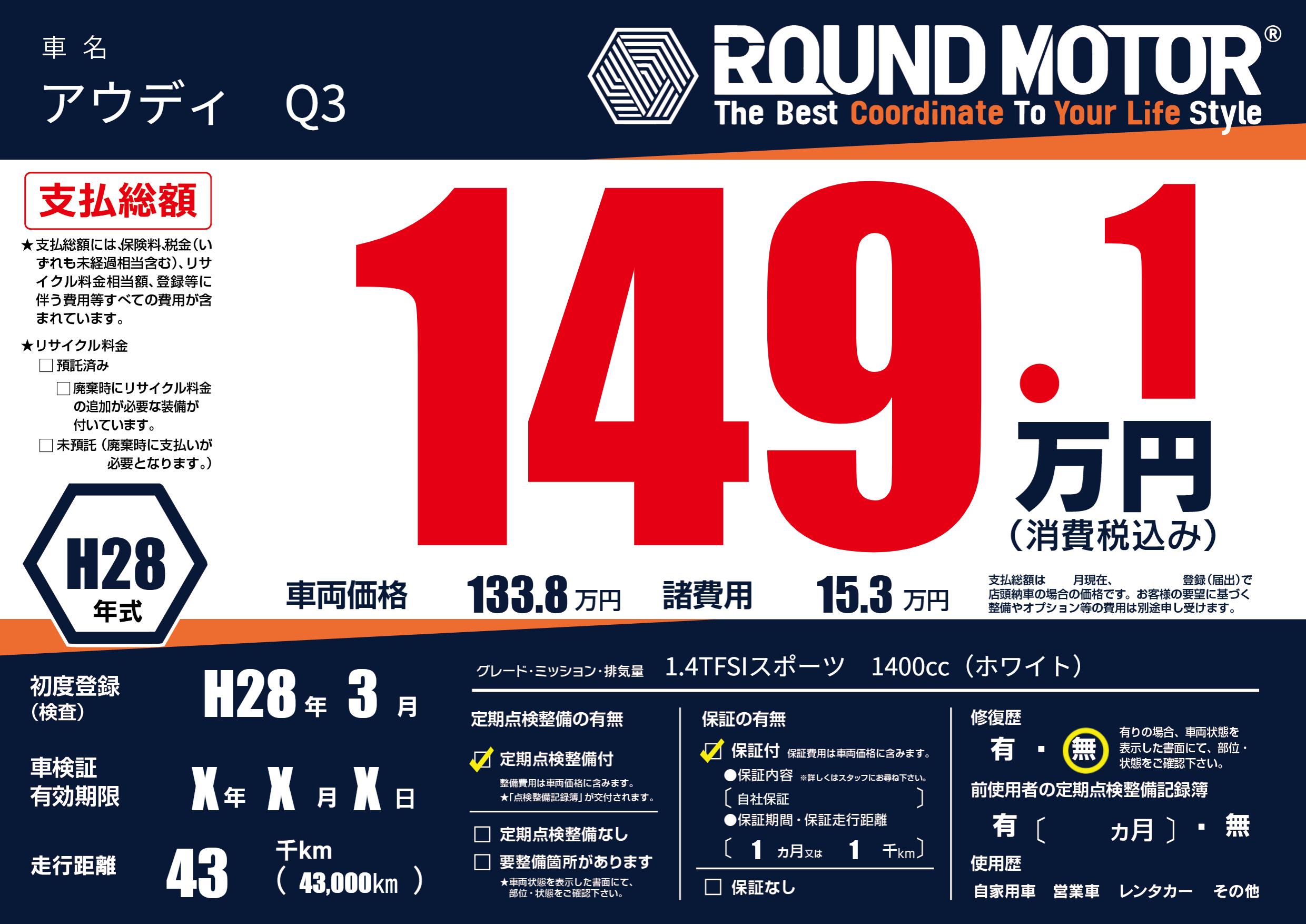 | 車名 | アウディ Q3 | グレード ミッション 排気量 |