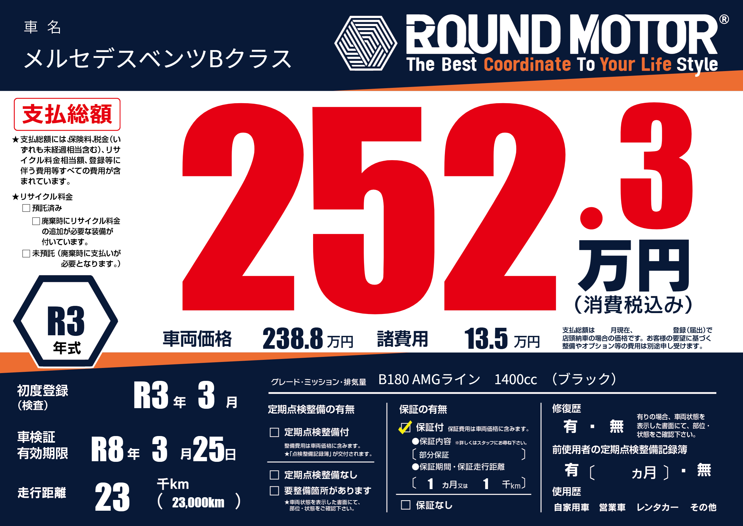 | 車名 | メルセデスベンツBクラス | グレード ミッション 排気量 |
