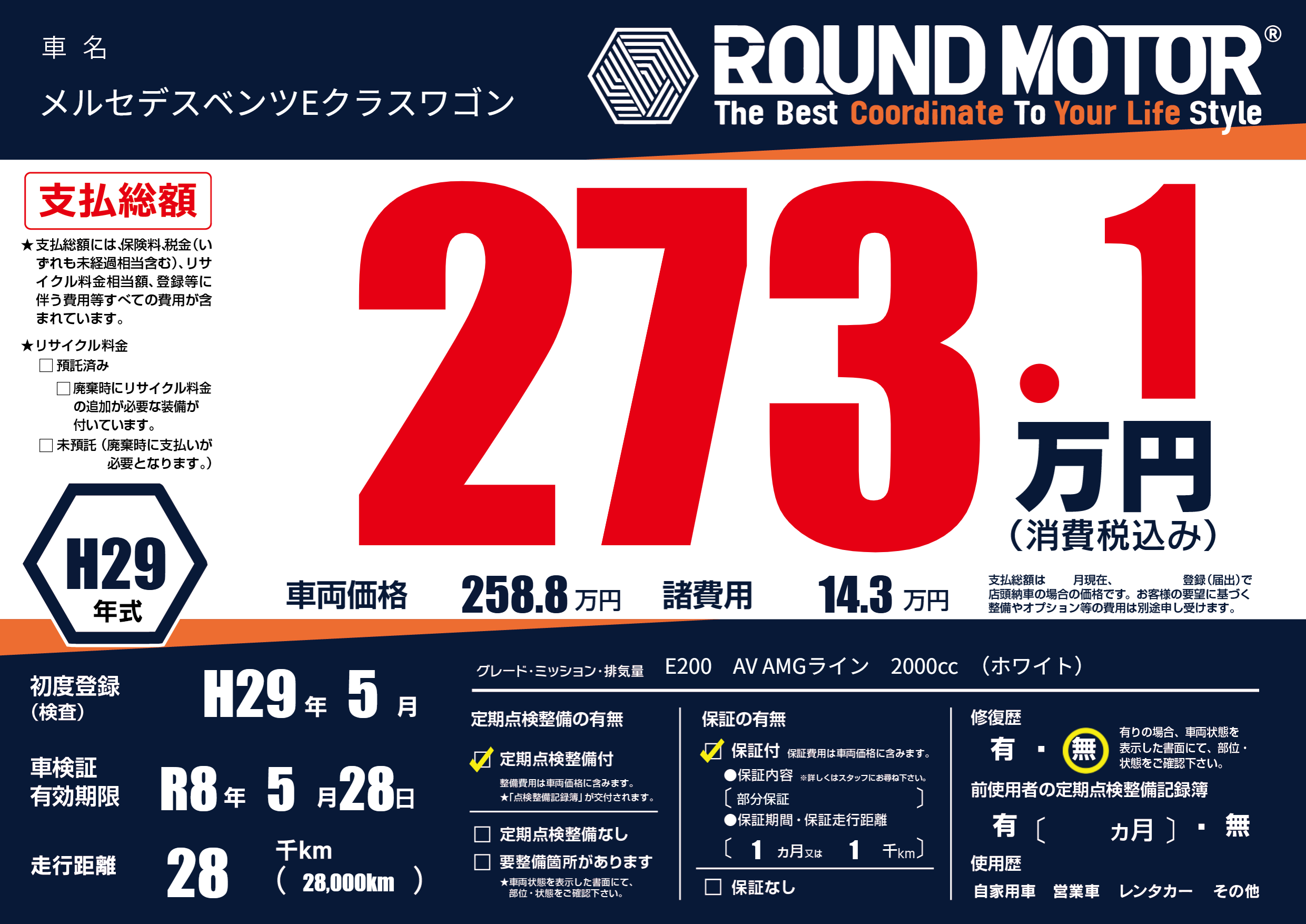 | 車名 | メルセデスベンツEクラスワゴン | グレード ミッション 排気量 |