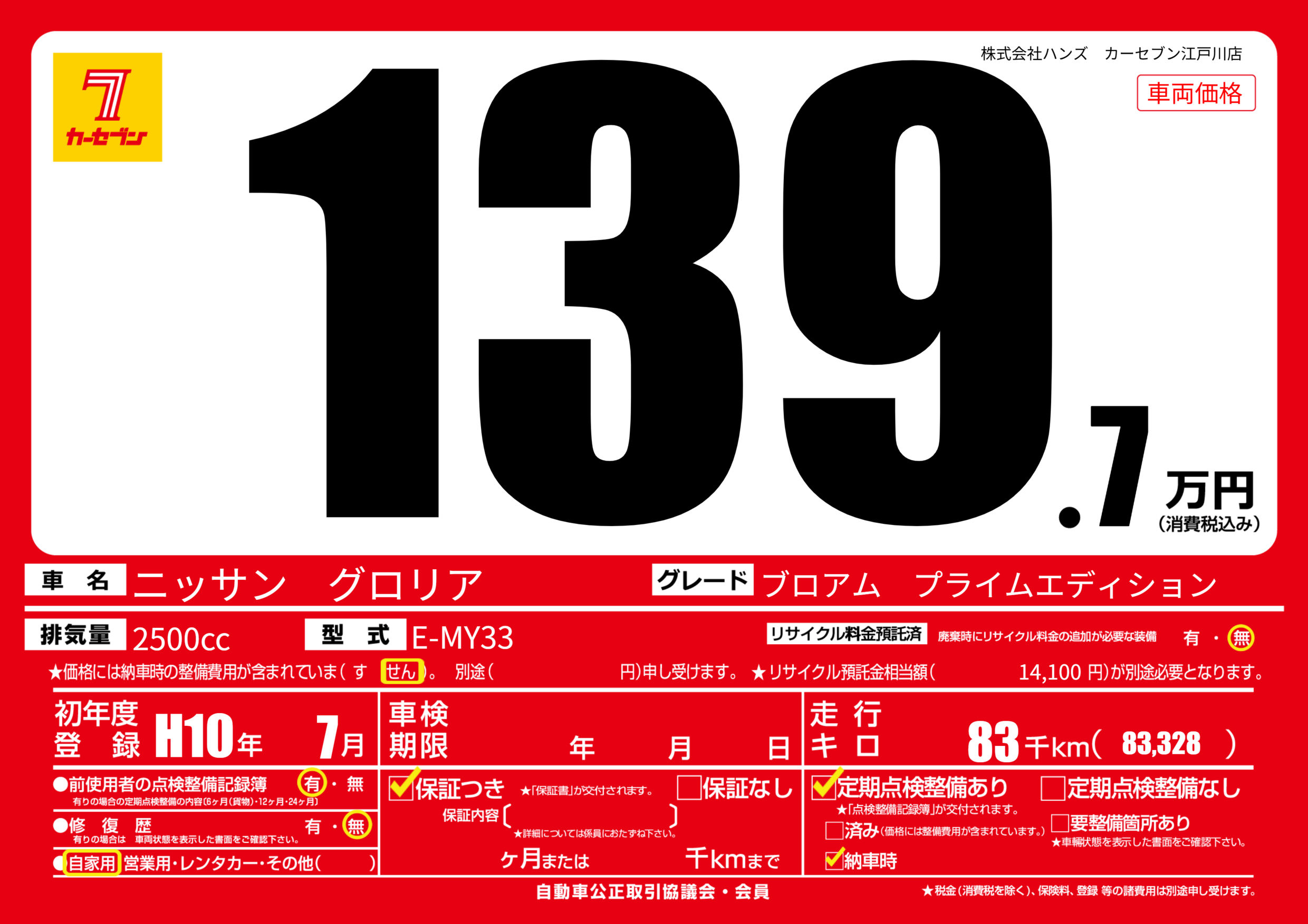 | 走行キロ | 8.3万km | 初年度登録 | H10年7月 |