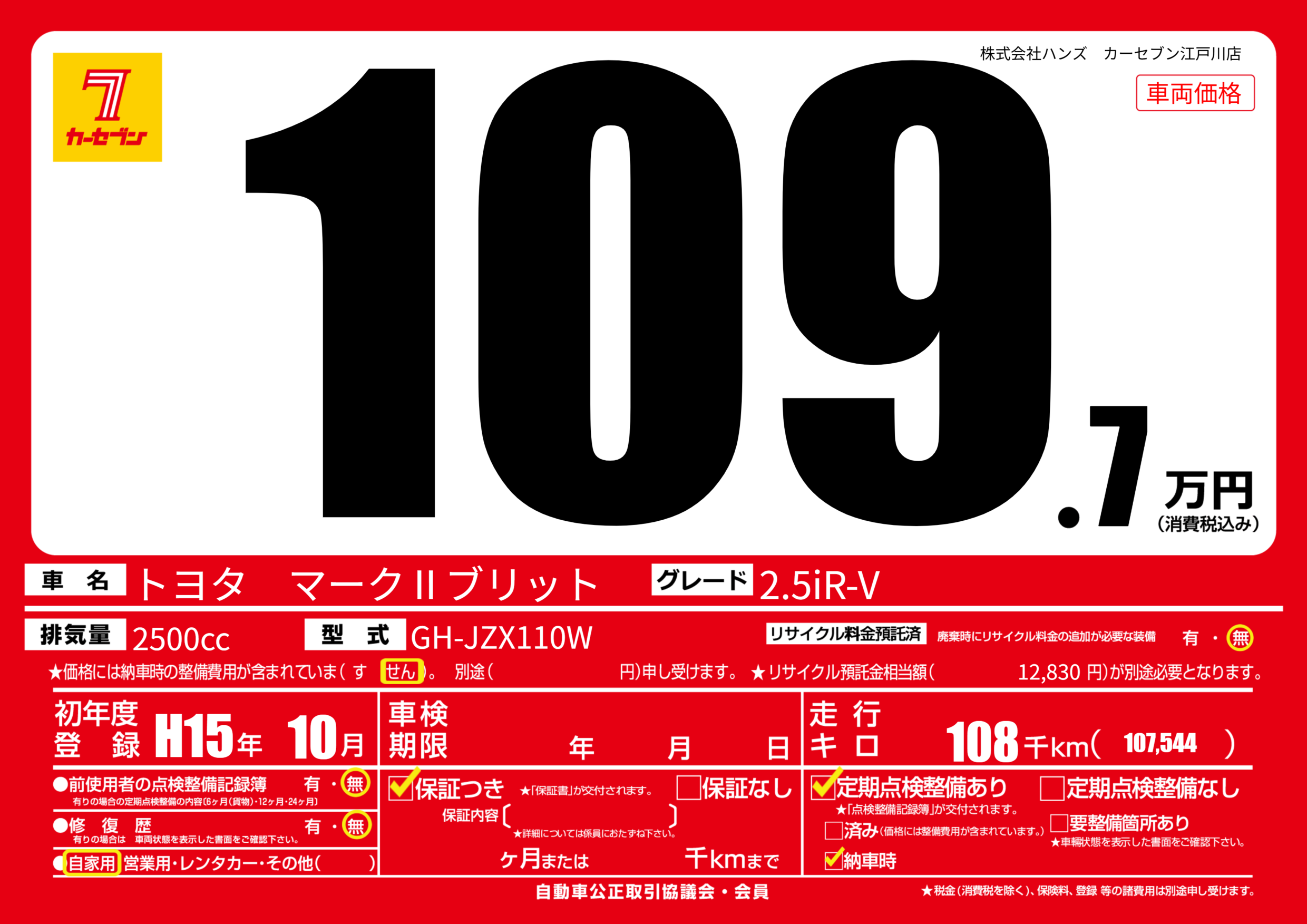 | 走行キロ | 10.8万km | 初年度登録 | H15年10月 |