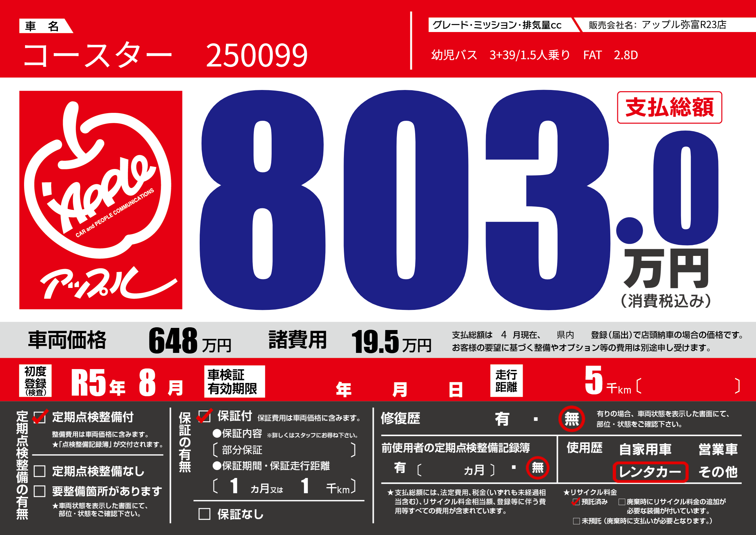 | 車名 | コースター 250099 | グレード ミッション 排気量 |