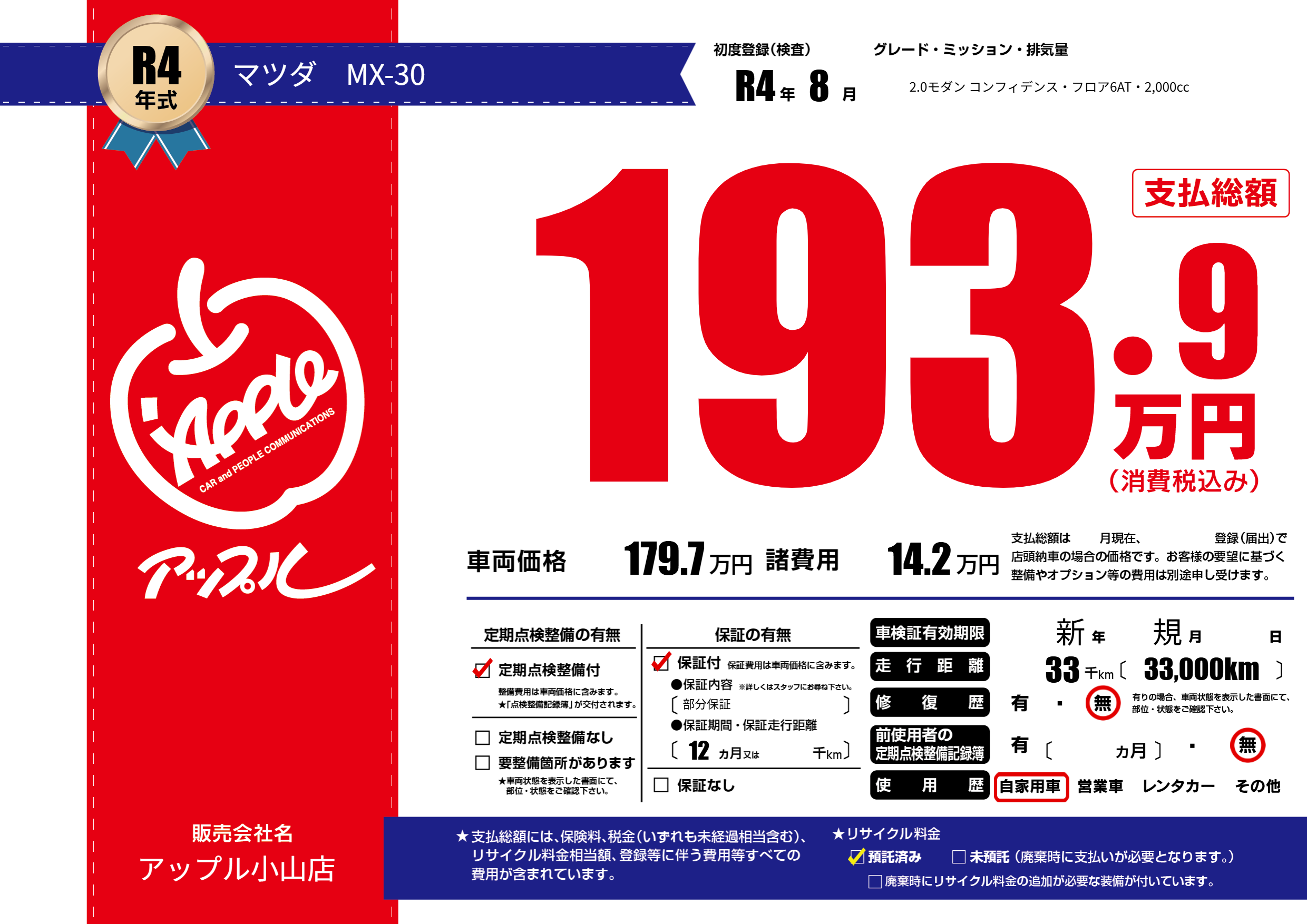 保証付き 保証内容(部分保証) 12ヶ月または()千kmまで |