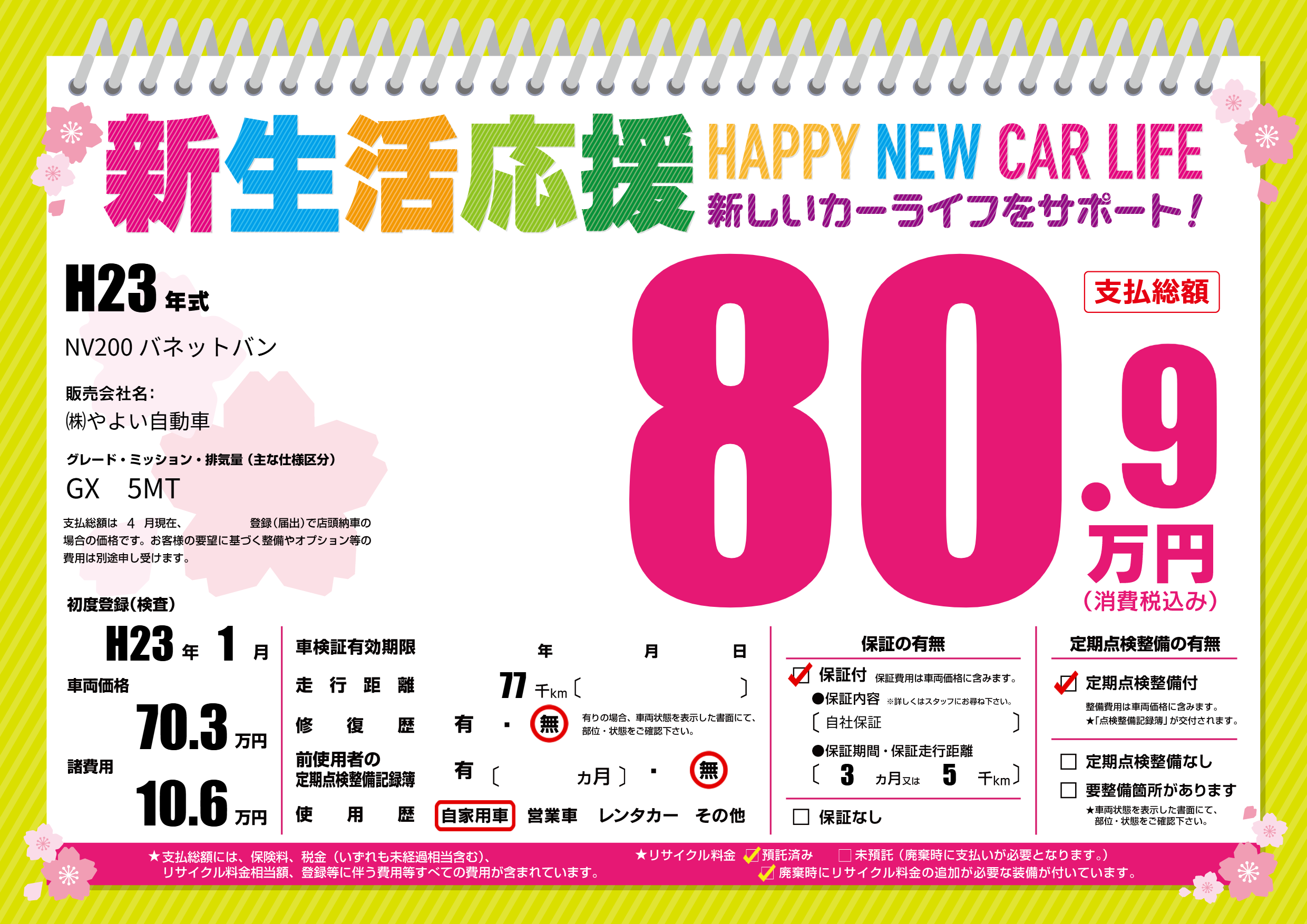 保証付き 保証内容(自社保証) 3ヶ月または(5)千kmまで |