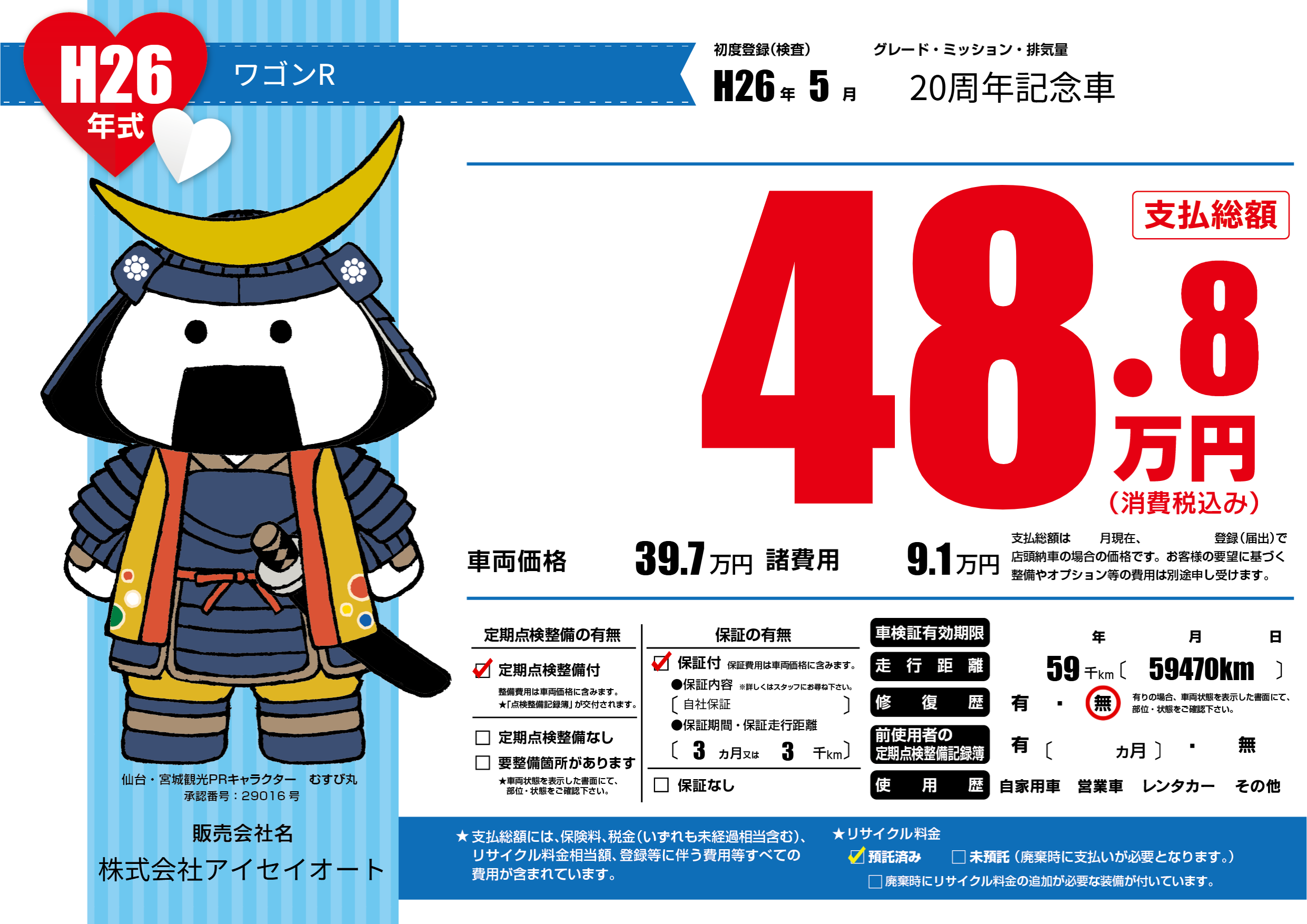 | 車名 | ワゴンR | グレード ミッション 排気量 |