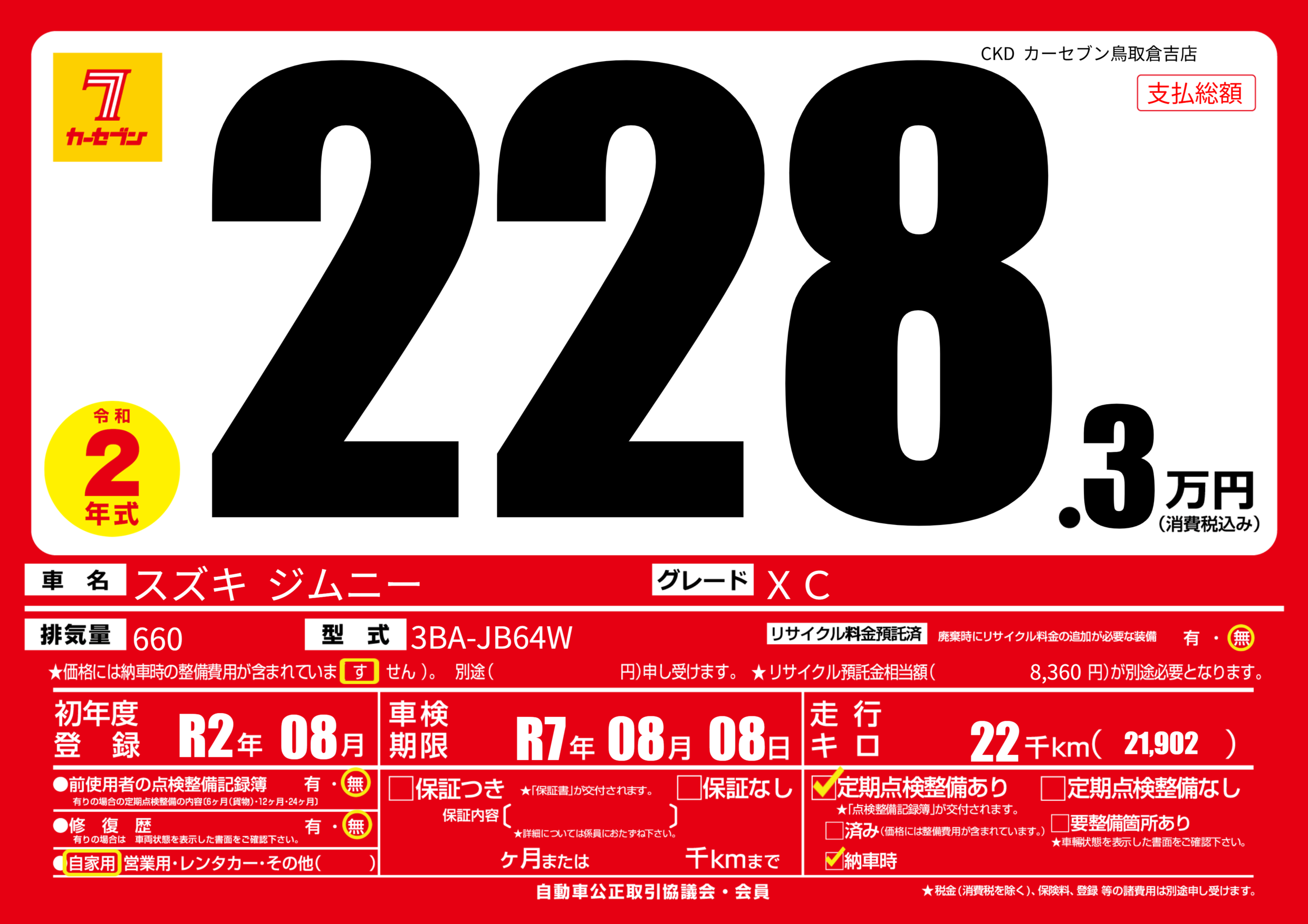 | 走行キロ | 2.2万km | 初年度登録 | R2年08月 |
