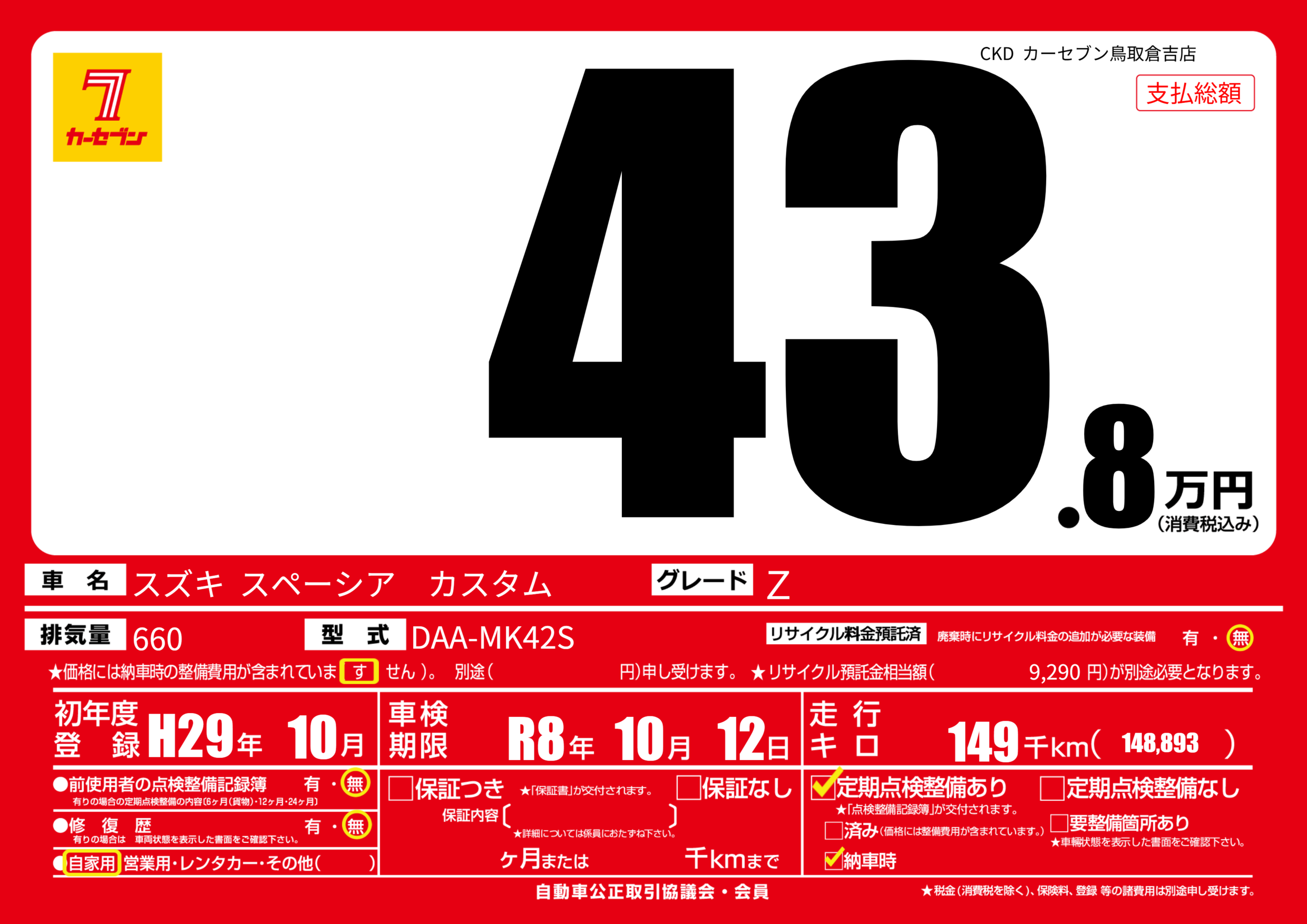 | 走行キロ | 14.9万km | 初年度登録 | H29年10月 |