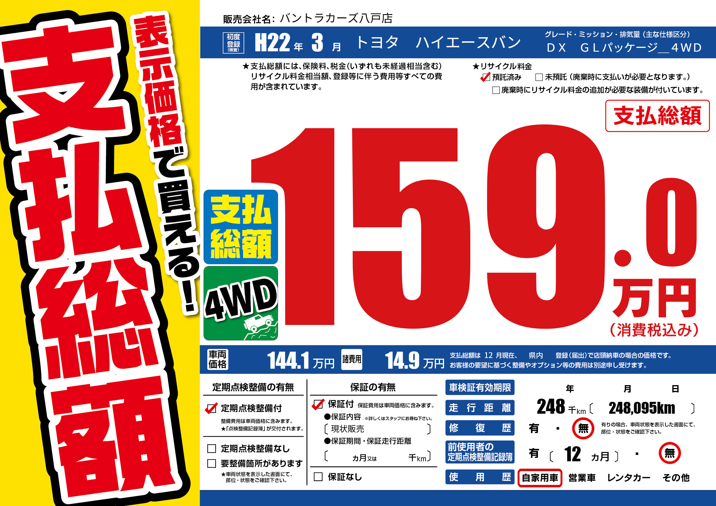 | 走行キロ | 24.8万km | 初年度登録 | H22年3月 |