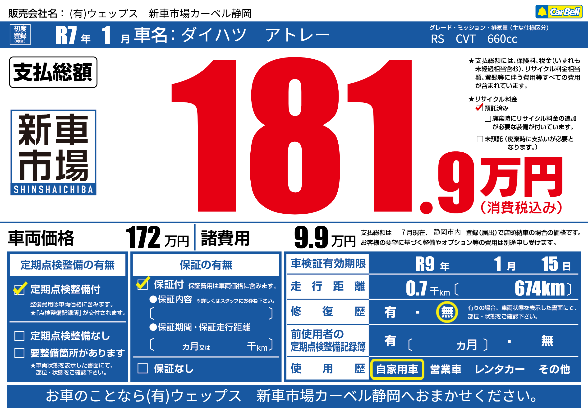 | 走行キロ | - | 初年度登録 | R7年1月 |