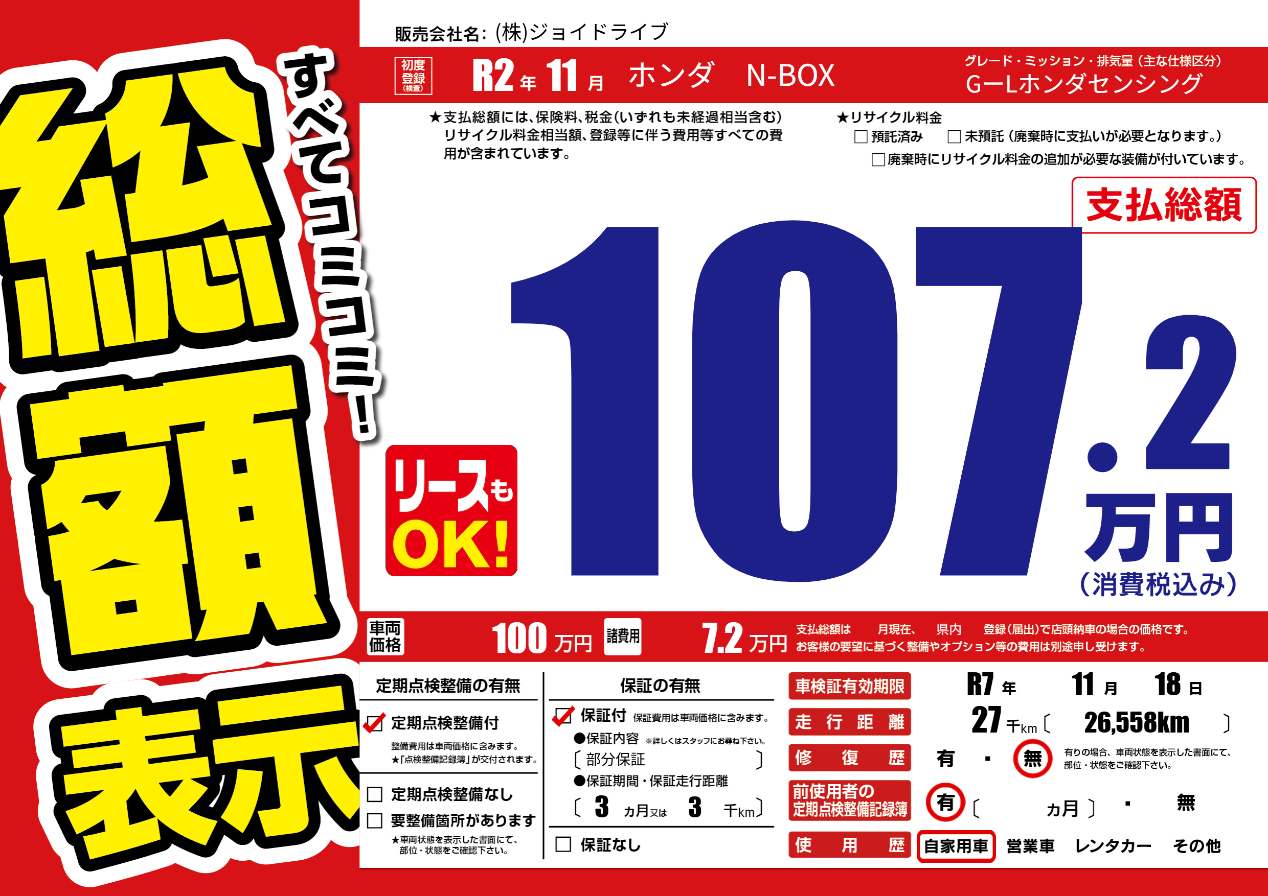 | 走行キロ | 2.7万km | 初年度登録 | R2年11月 |