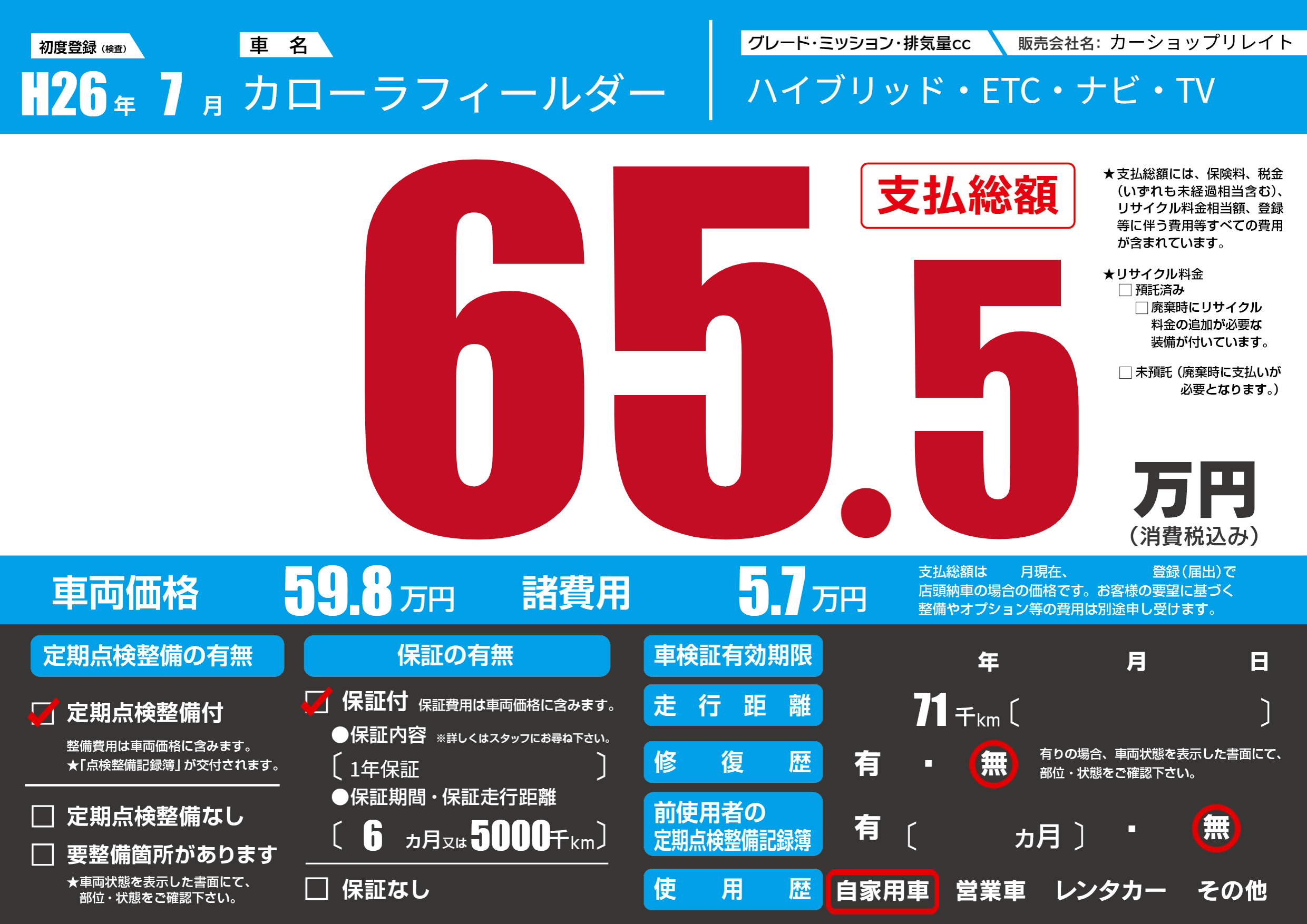 | 走行キロ | 7.1万km | 初年度登録 | H26年7月 |
