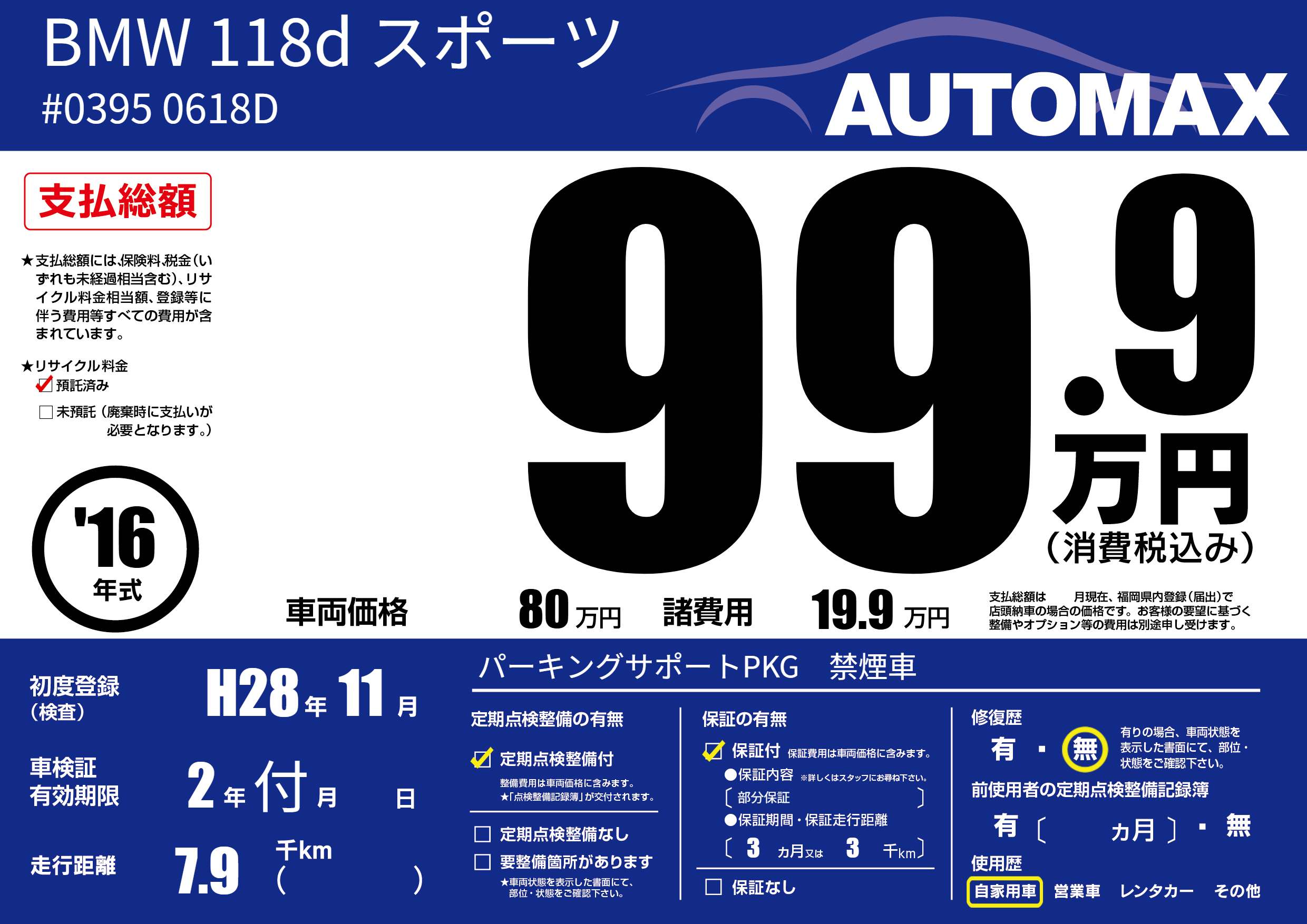 | 車名 | BMW 118d スポーツ | グレード ミッション 排気量 |