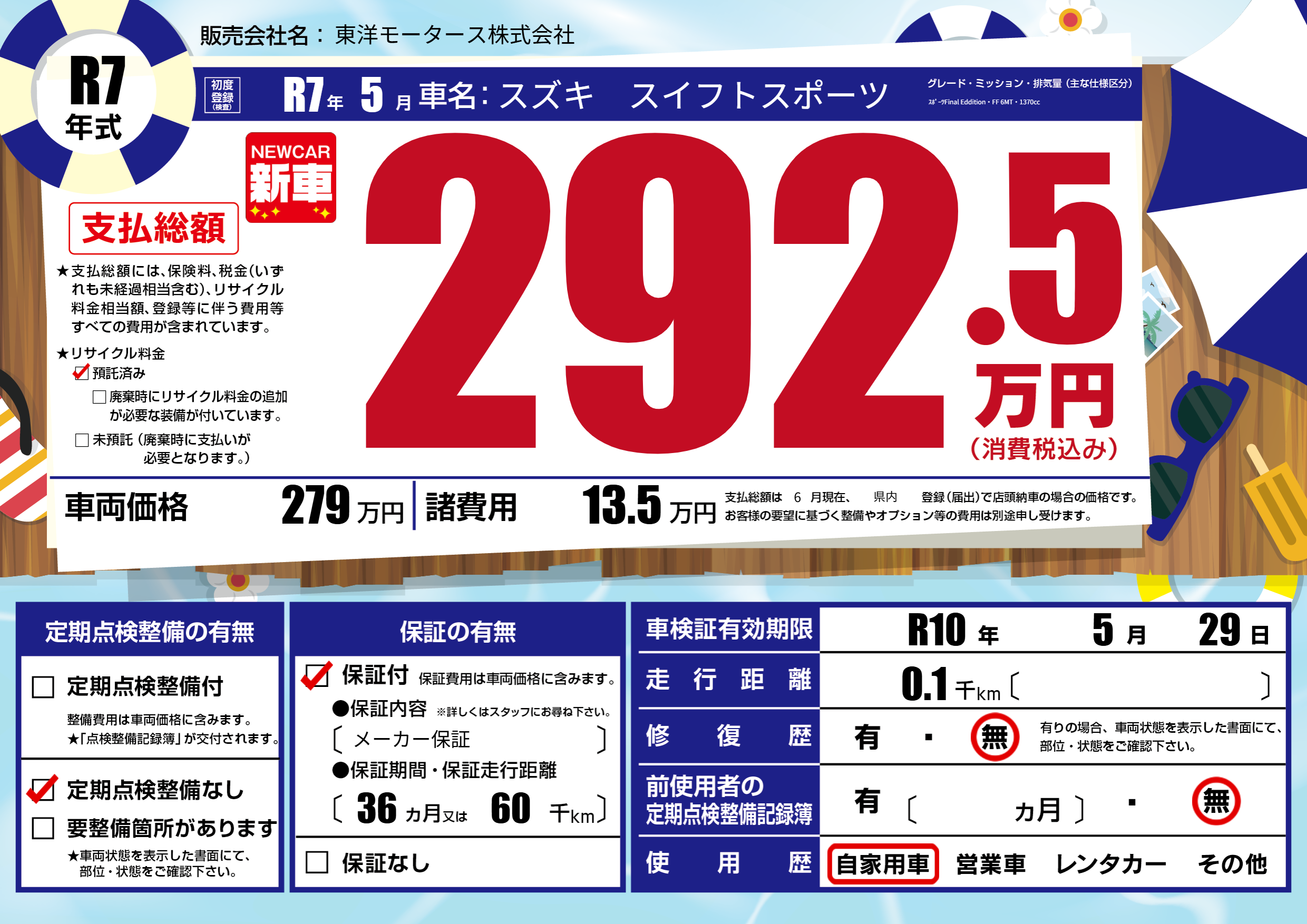 | 車名 | スズキ スイフトスポーツ | グレード ミッション 排気量 |
