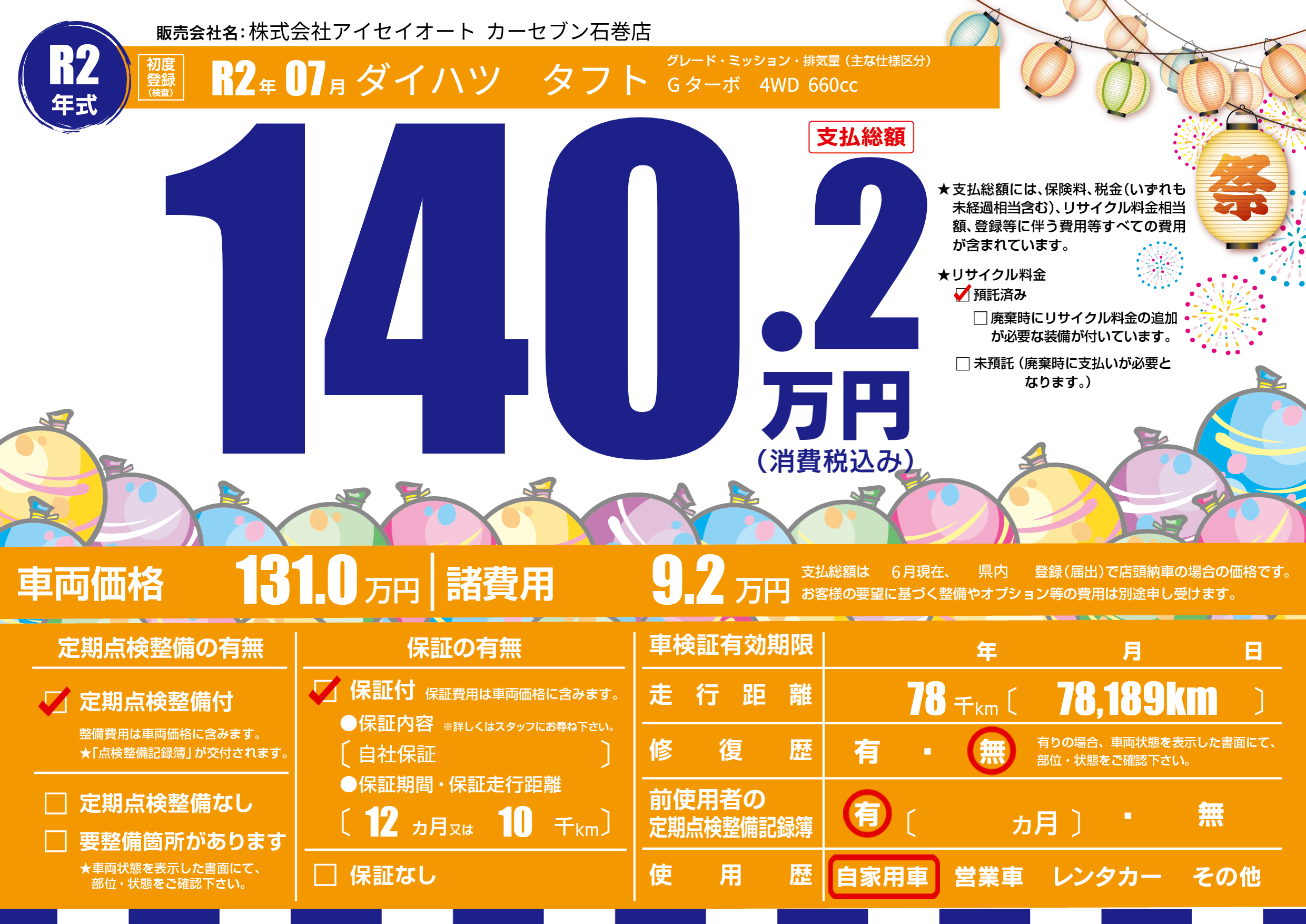 | 走行キロ | 7.8万km | 初年度登録 | R2年07月 |