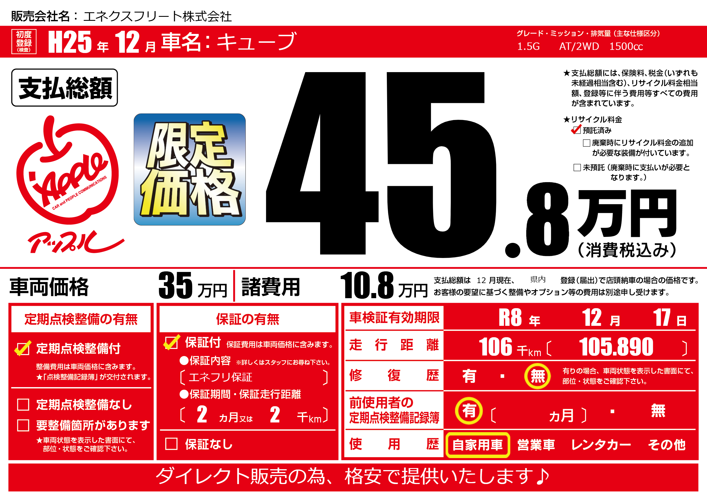 保証付き 保証内容(エネフリ保証) 2ヶ月または(2)千kmまで |