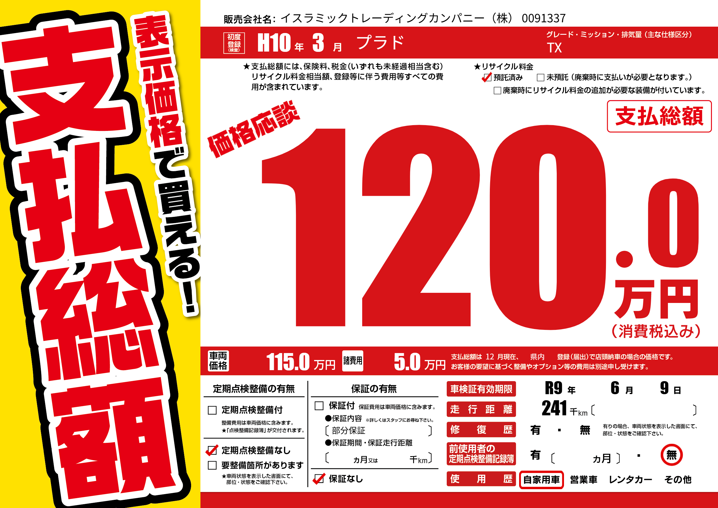 | 走行キロ | 24.1万km | 初年度登録 | H10年3月 |