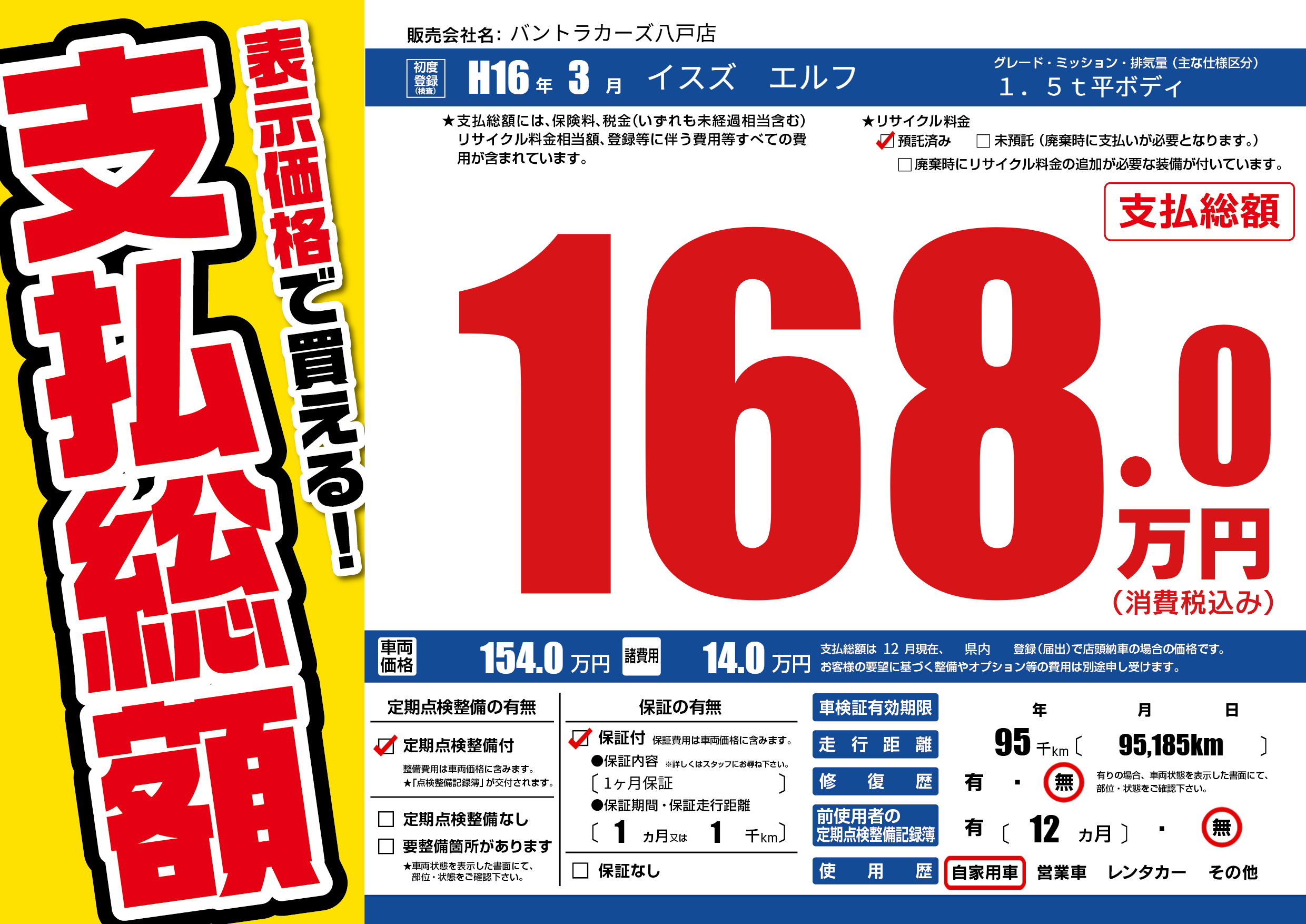 | 走行キロ | 9.5万km | 初年度登録 | H16年3月 |