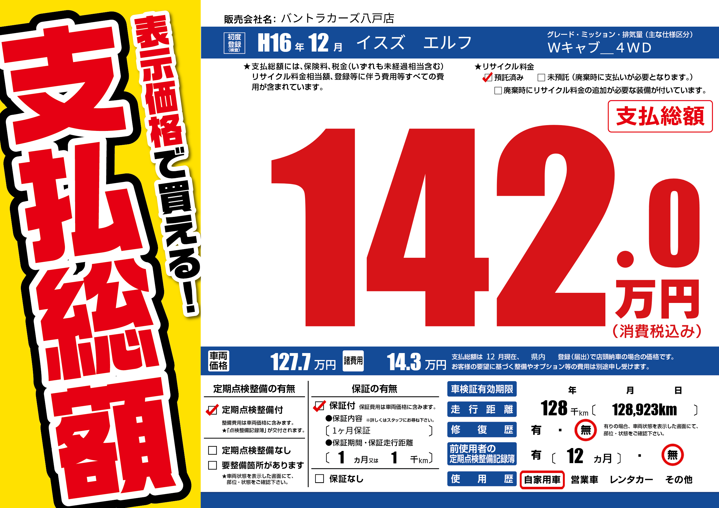 | 走行キロ | 12.8万km | 初年度登録 | H16年12月 |