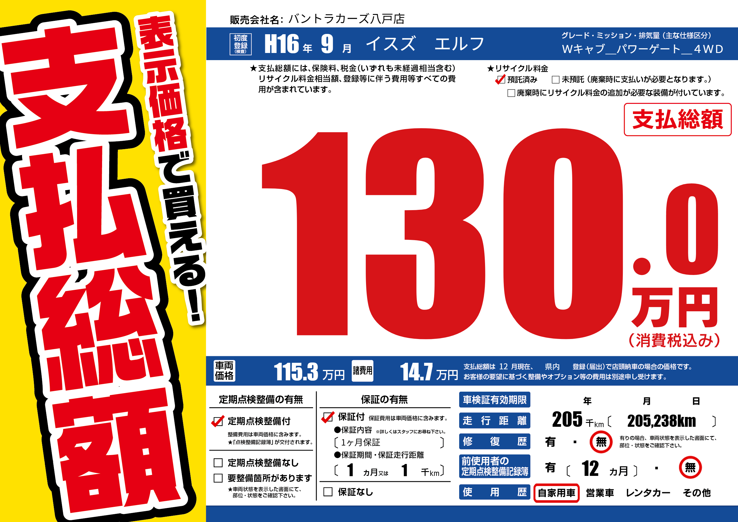 | 走行キロ | 20.5万km | 初年度登録 | H16年9月 |