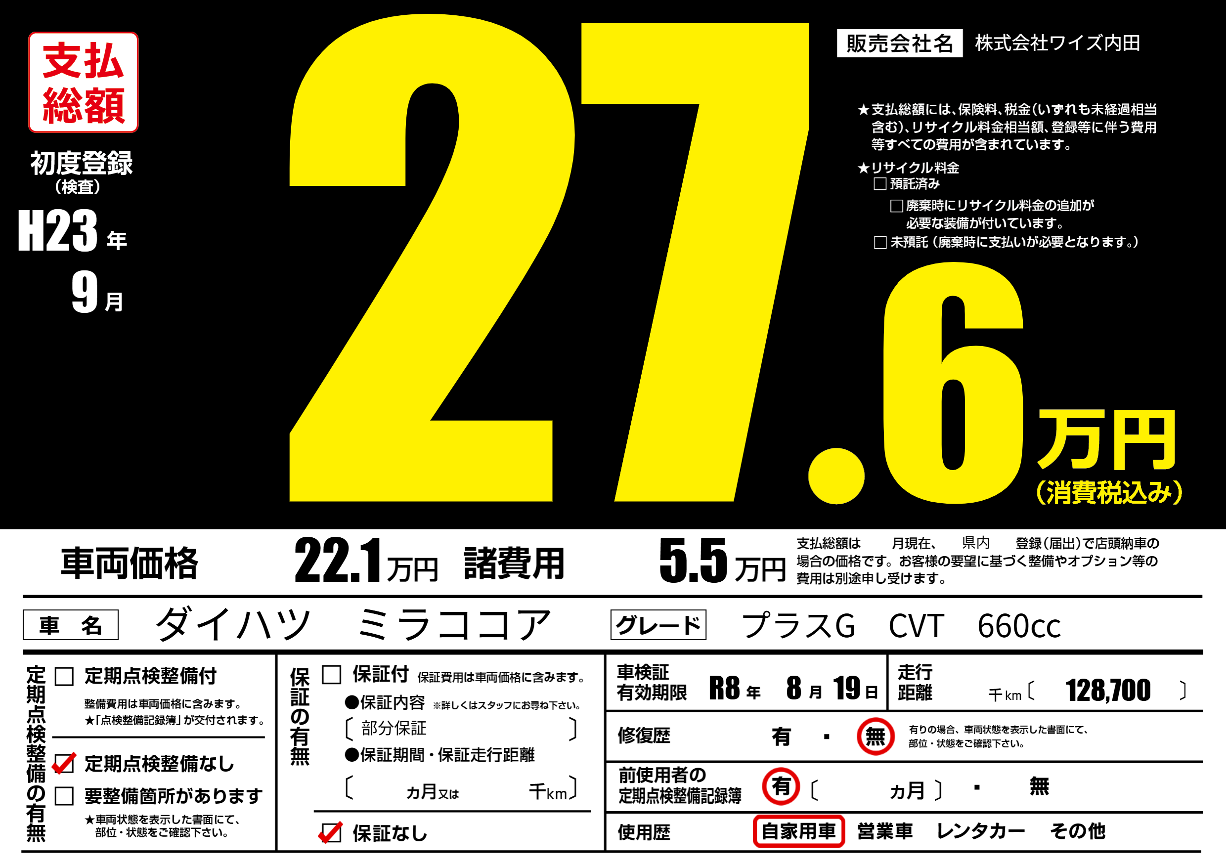 | 走行キロ | - | 初年度登録 | H23年9月 |