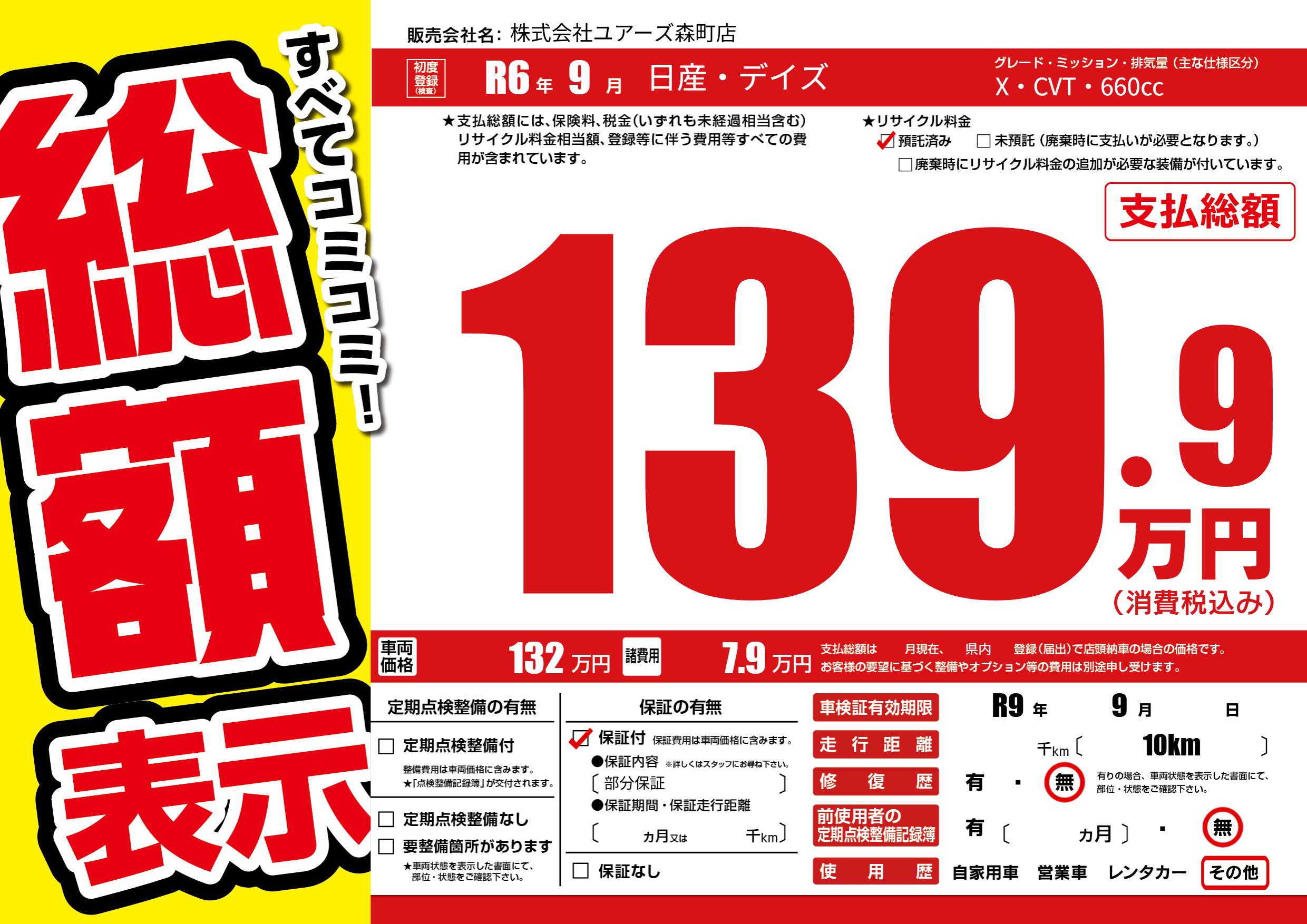 | 車名 | 日産・デイズ | グレード ミッション 排気量 |