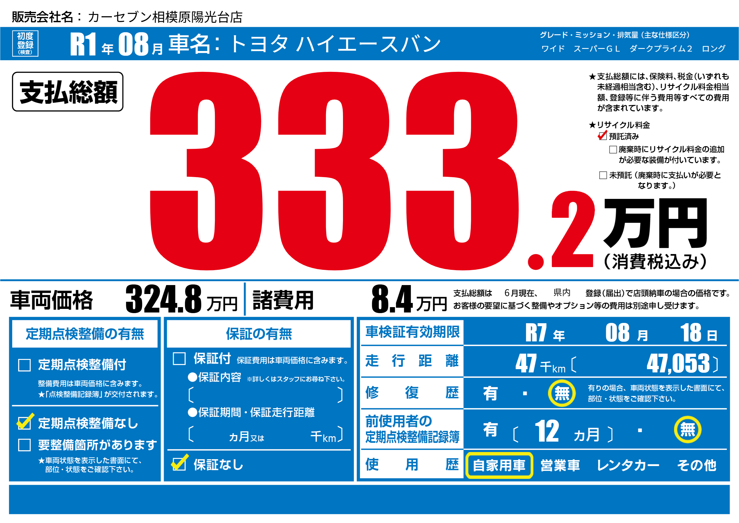 | 車名 | トヨタ ハイエースバン | グレード ミッション 排気量 |