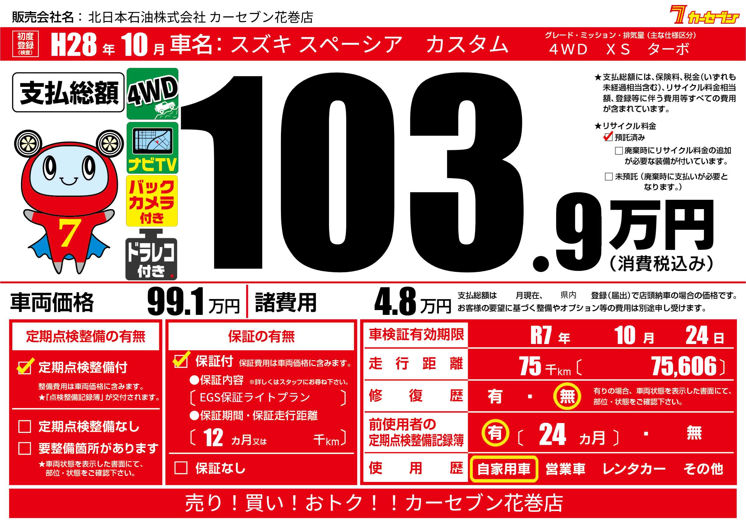 | 走行キロ | 7.5万km | 初年度登録 | H28年10月 |