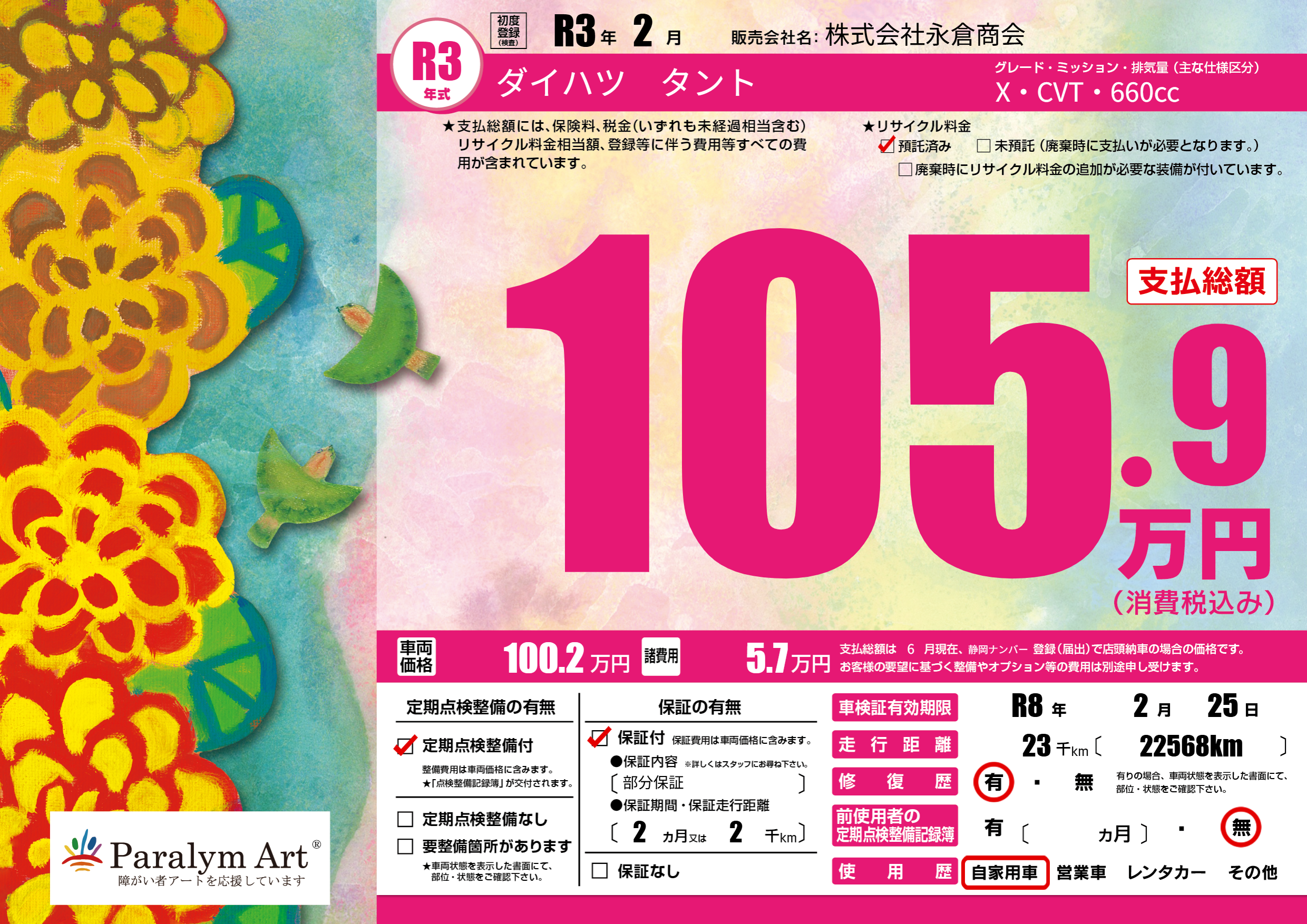 | 車名 | ダイハツ タント | グレード ミッション 排気量 |