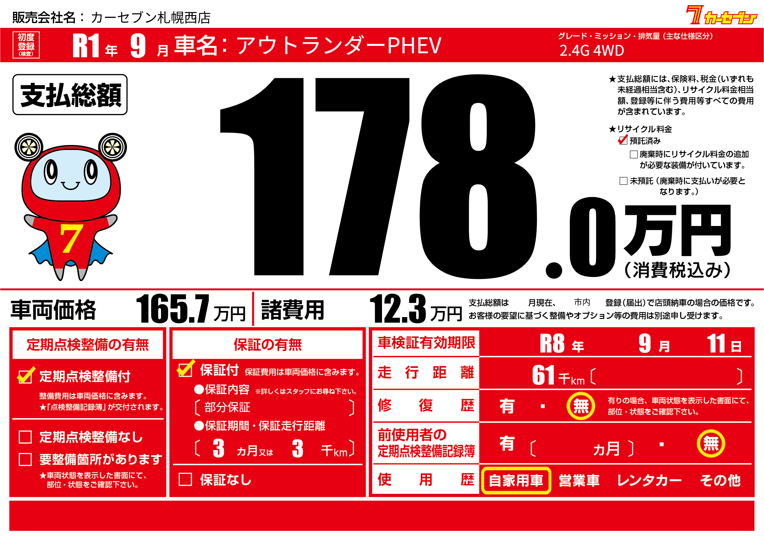 | 車名 | アウトランダーPHEV | グレード ミッション 排気量 |
