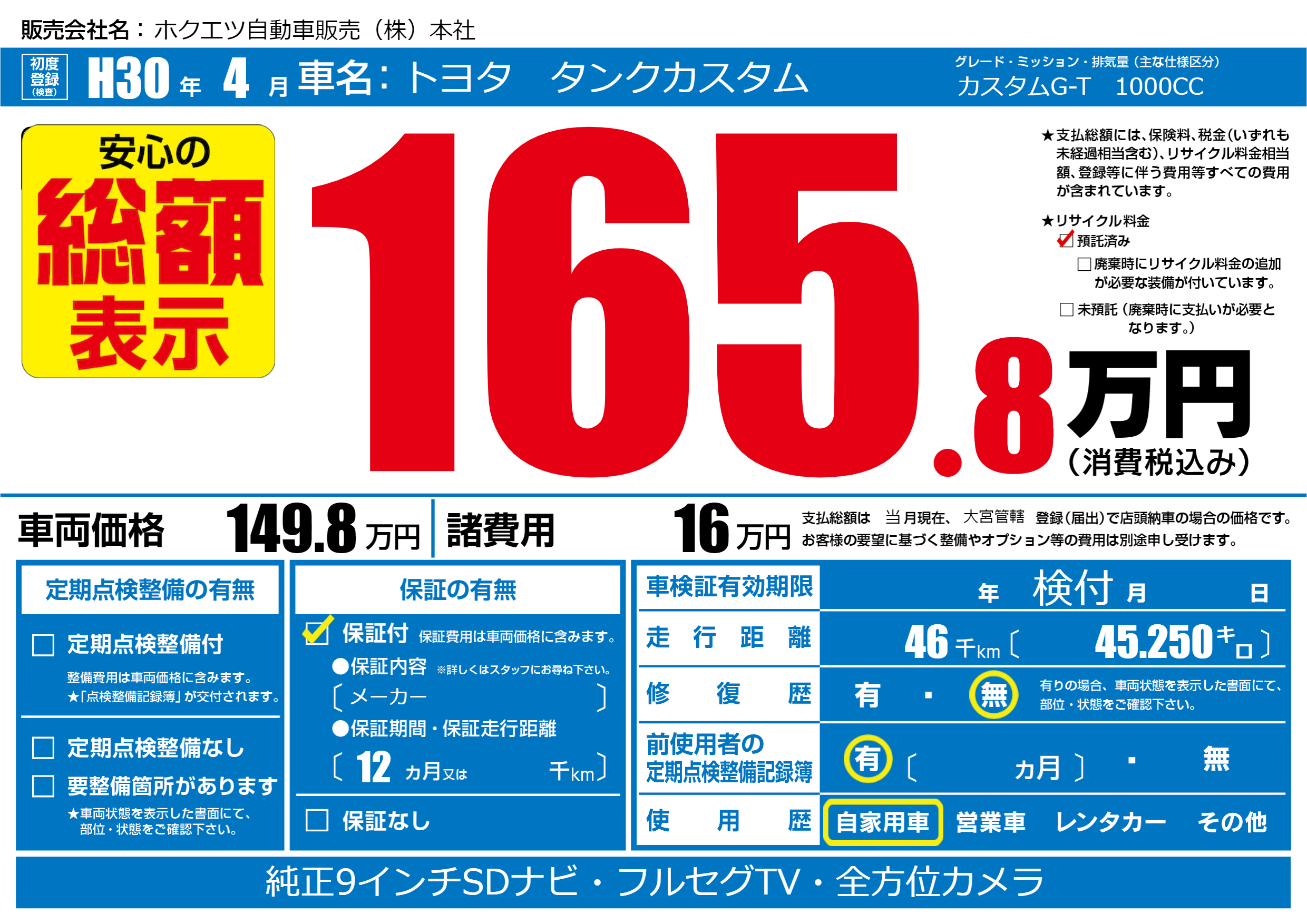 | 車名 | トヨタ タンクカスタム | グレード ミッション 排気量 |