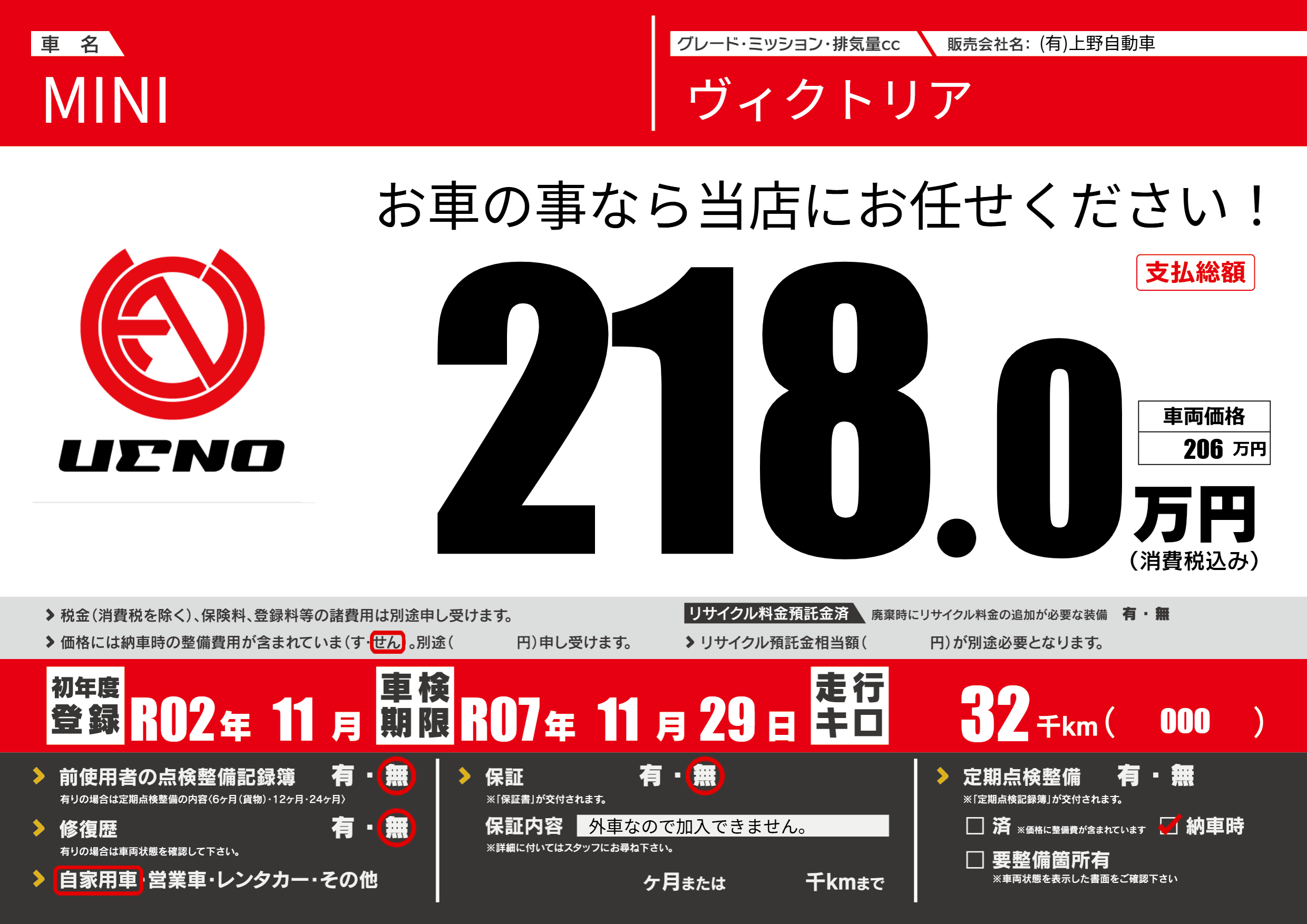 保証なし 保証内容(外車なので加入できません。) ---ヶ月または()千kmまで |