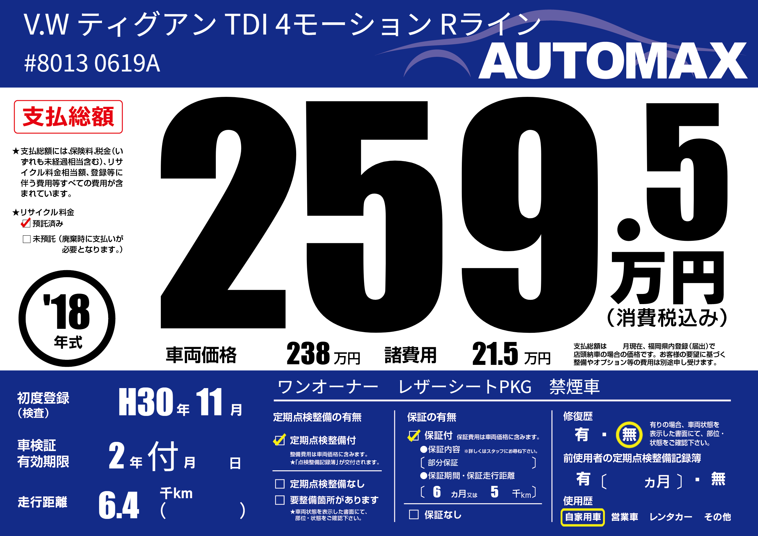 | 車名 | V.W ティグアン TDI 4モーション Rライン | グレード ミッション 排気量 |