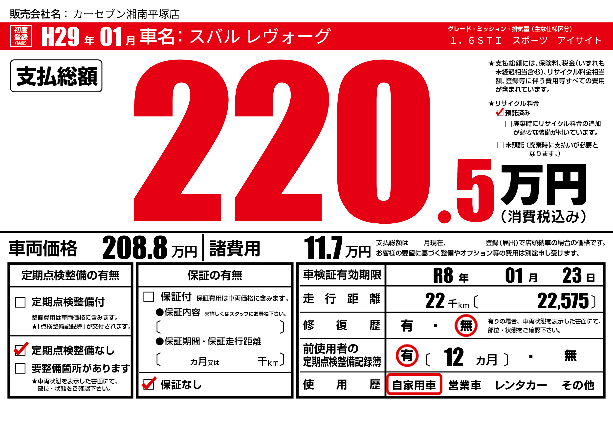 | 車名 | スバル レヴォーグ | グレード ミッション 排気量 |