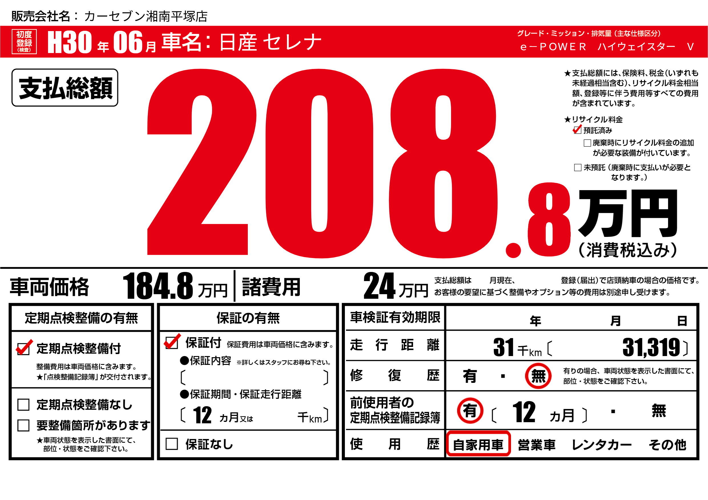 | 車名 | 日産 セレナ | グレード ミッション 排気量 |