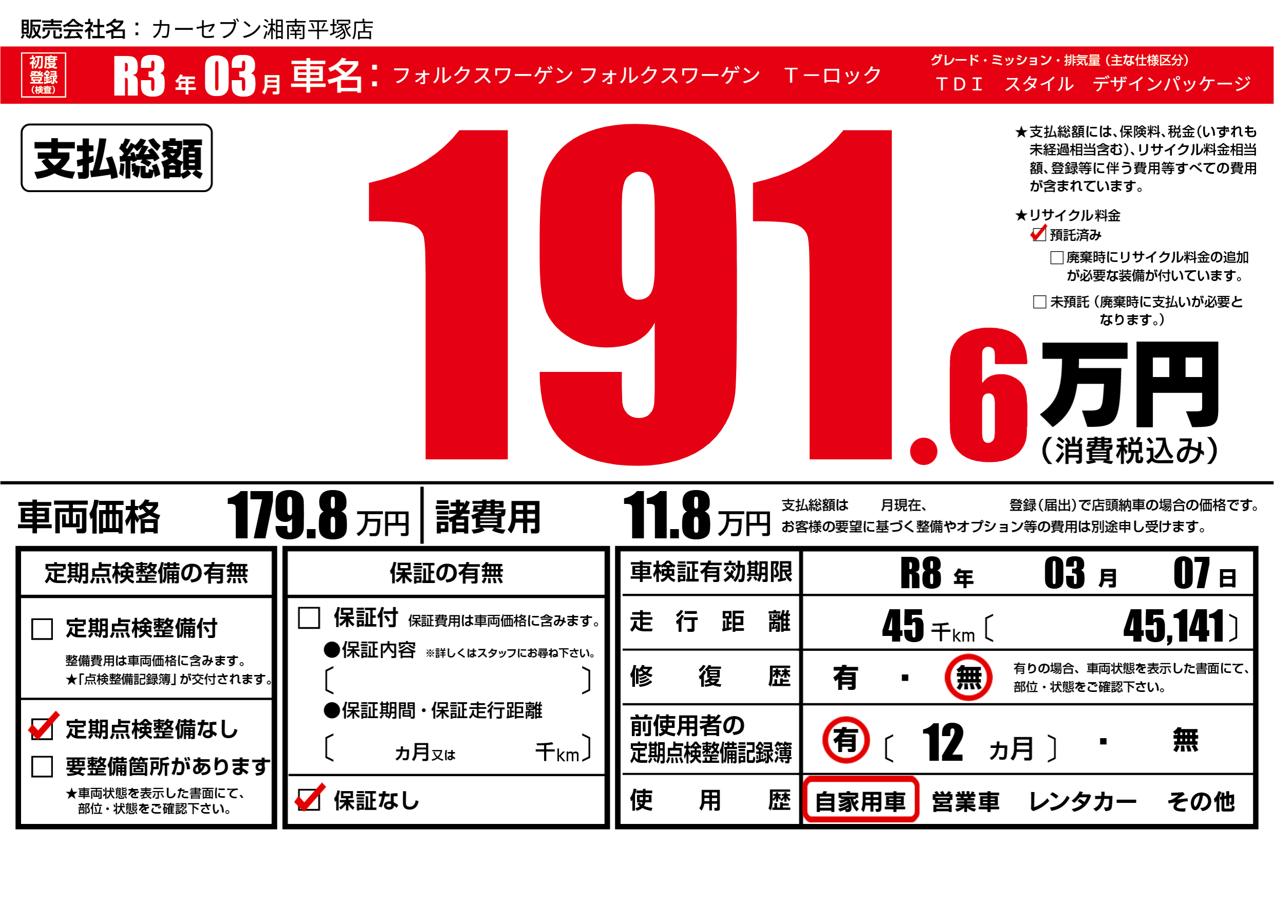 | 定期点検整備 | 定期点検整備なし | ||